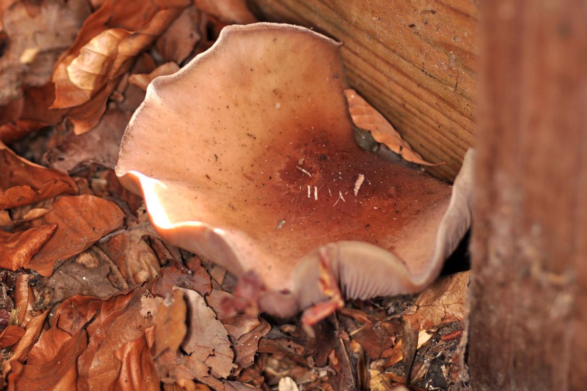 paddenstoel stond onder de achterwand houthok in nabijheid beukenhaag. Hoed diameter ongeveer 15 cm. Lamellen gebogen aangehecht, steel verkleurde violet bij aanraken. Sporen grijs.