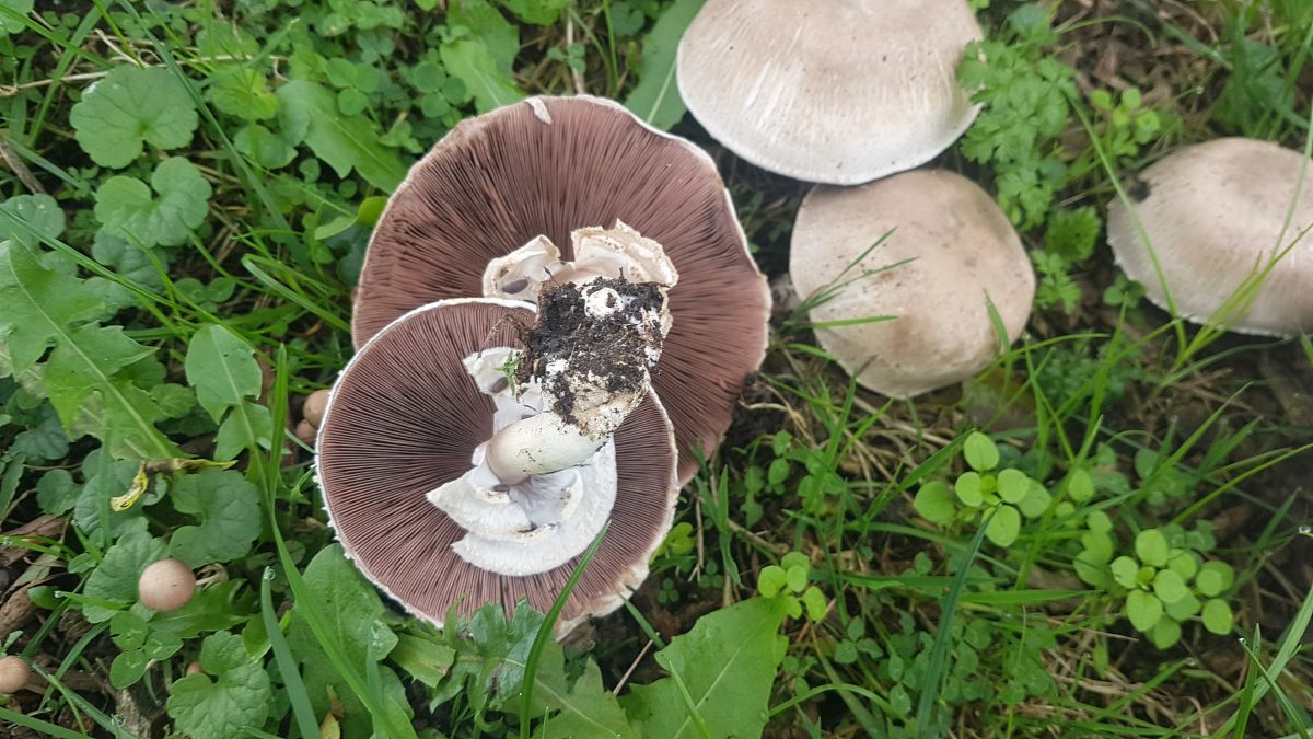 Ik wil graag weten welke zwam dit is. Er stond een groep in een wegberm. Enkele hadden een hoed van 15 tot 20 cm. De hoogte schat ik op 12 tot 15 cm. Kleur van de hoed vuilgrijs, lamellen zijn bruin.