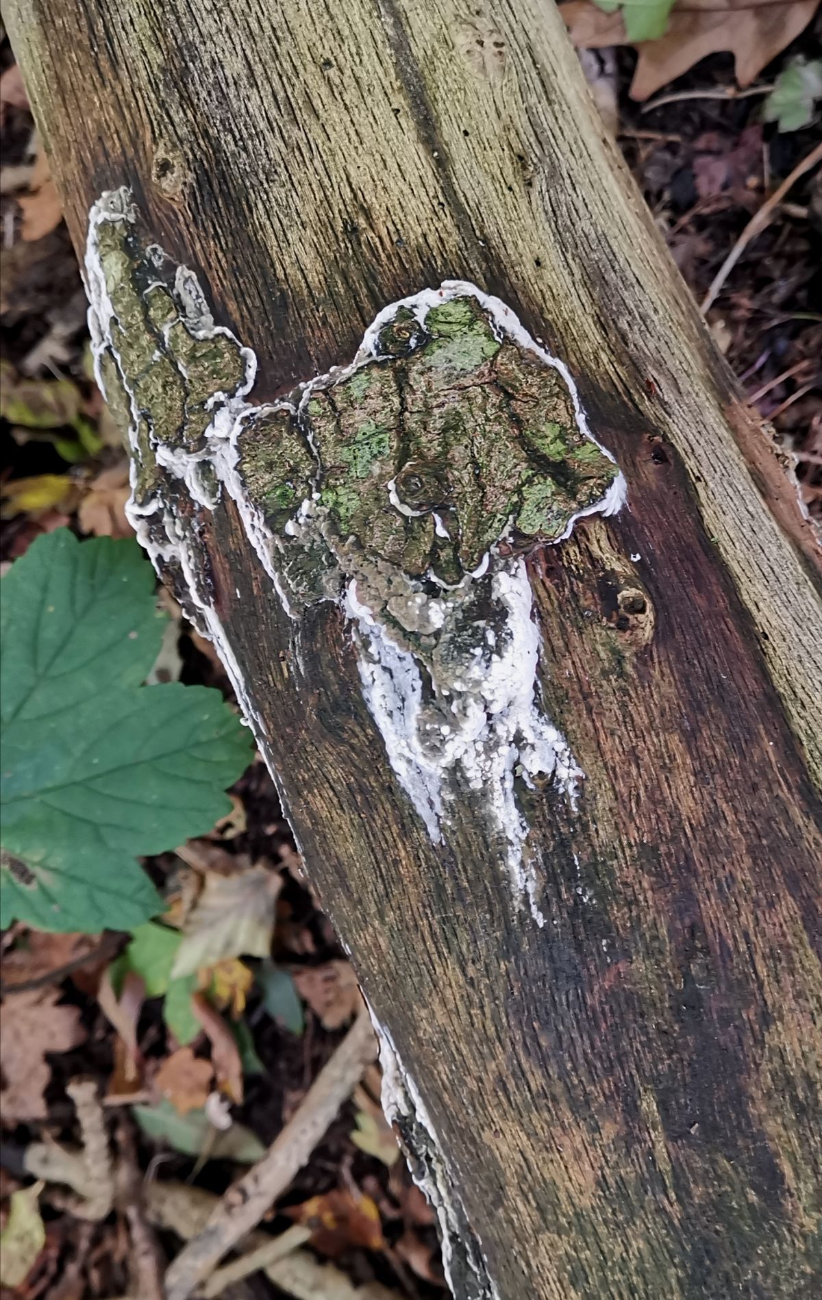 Tijdens een wandeling op zondag 19/10/2019 bij het Dwingelderveld in Drenthe zagen we op het zaagvlak van een omgezaagde berk deze kleine paarse bolletjes.