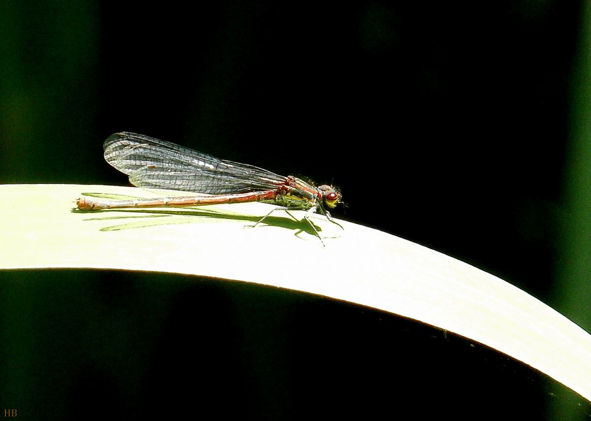 Deze waterjuffer in de felle zon gefotografeerd waardoor de kleuren wat fletszijn uitgevallen.Ik kom er niet uit waar ik mee te maken heb .De lichte poten, het donkerbruinige oogje geven me geen uitsluitsel.Kan het zijn dat het een net uitgeslopen exemplaar is ?Zittend op een blad van een rietstenge...