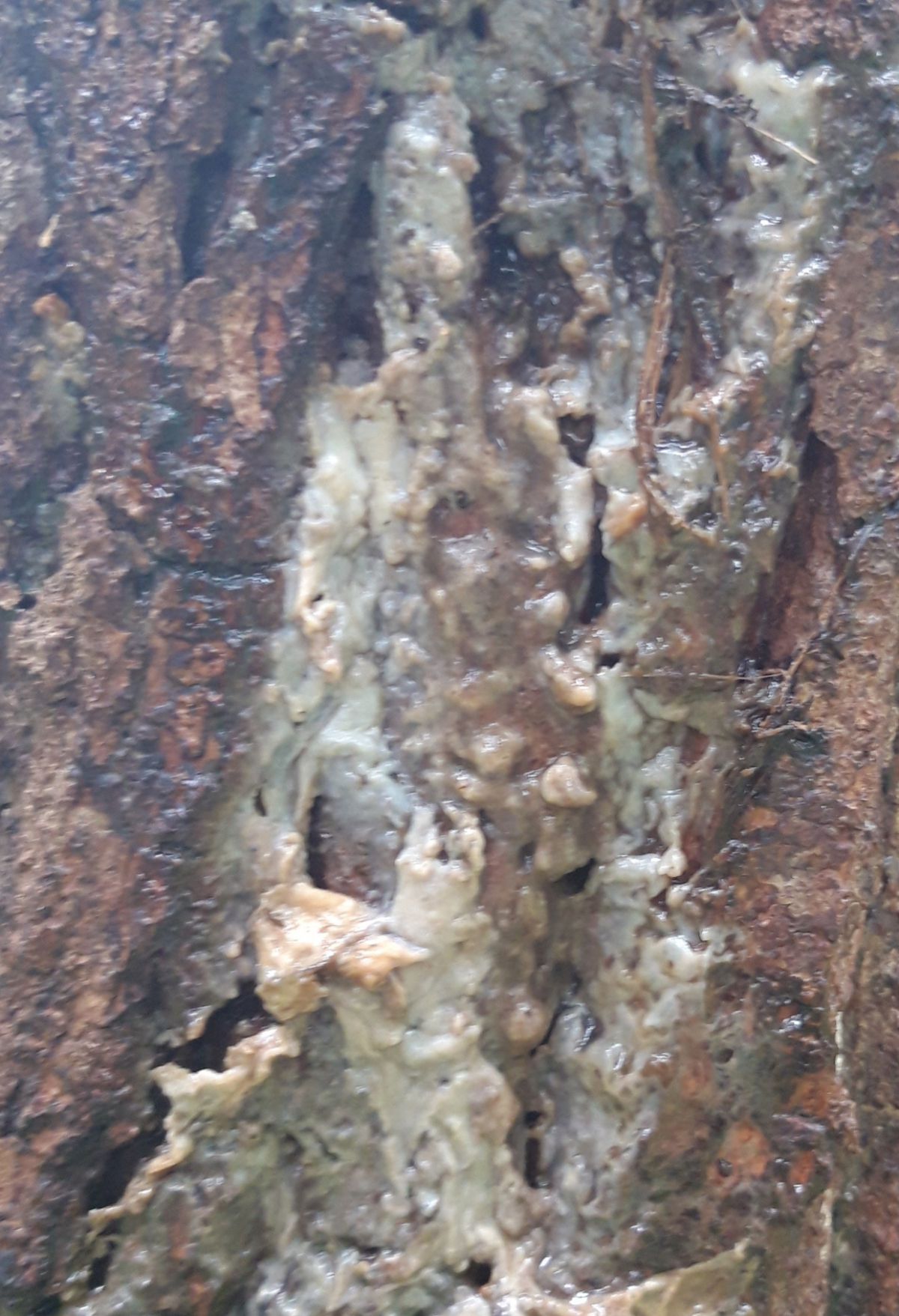 Op de stam is plastselijk een slijmerige zwamachtige substantie waar te nemen.