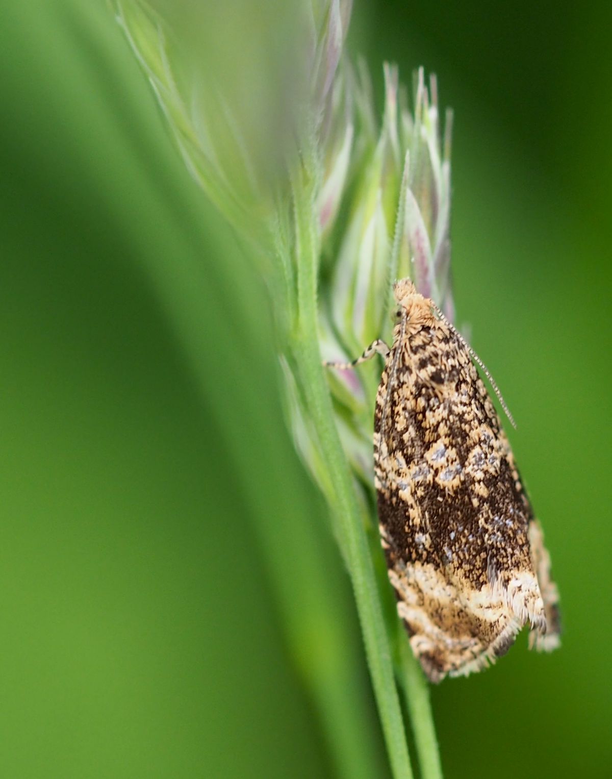 Zou dit een wollige kortvleugelmot kunnen zijn? Maar kan het blauw in de vleugels niet rijmen....