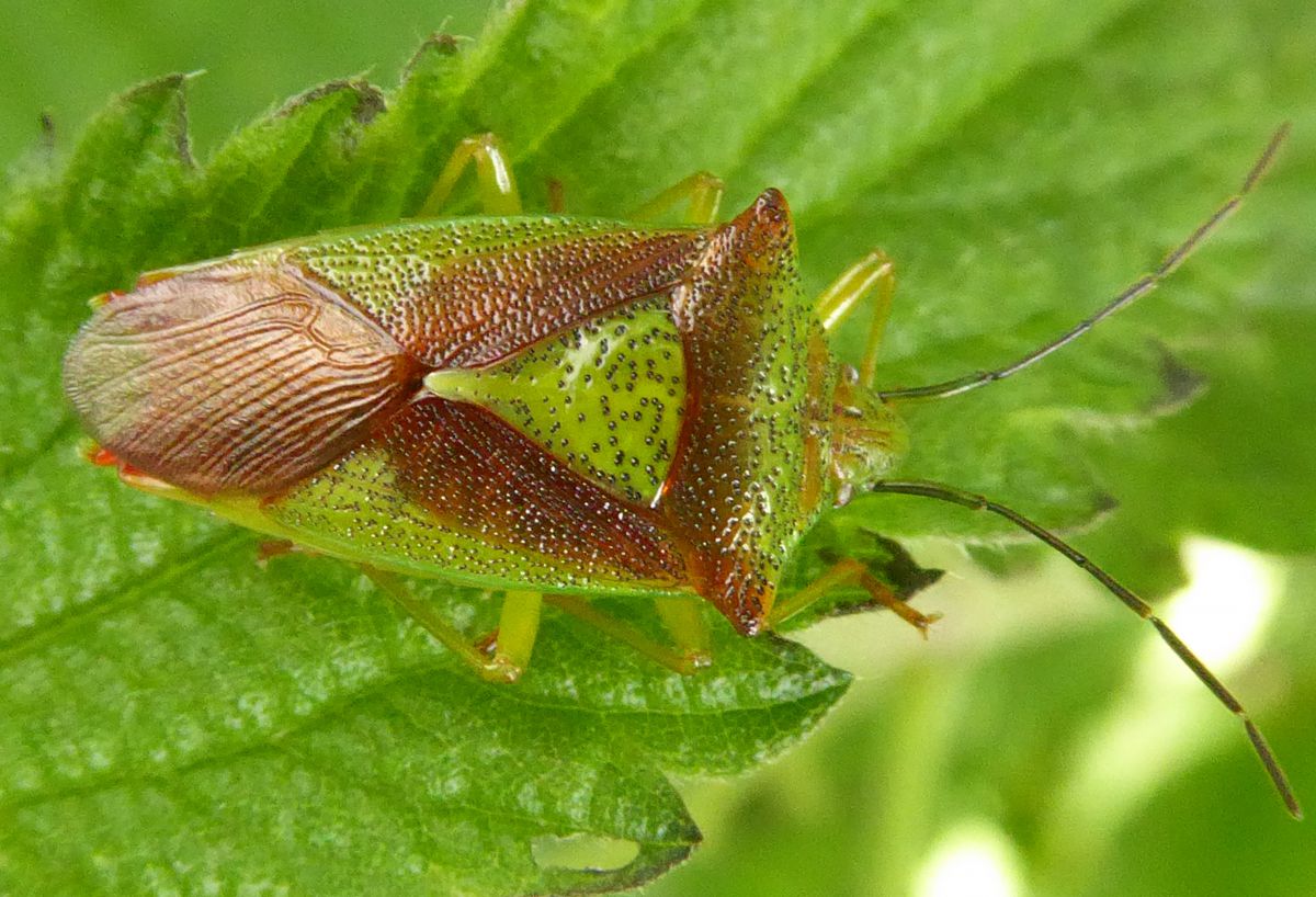 voor gebiedbeschrijving: zie wants (1)gevonden op brandnetelik dacht eerst aan zuringrandwants, maar de twee zwarte stippen links- en rechtsboven op het schildje zaten me dwars. M.b.v. Veldgids wantsen deel 1 kwam ik op de snuitkeverschildwants uit (blz. 47)