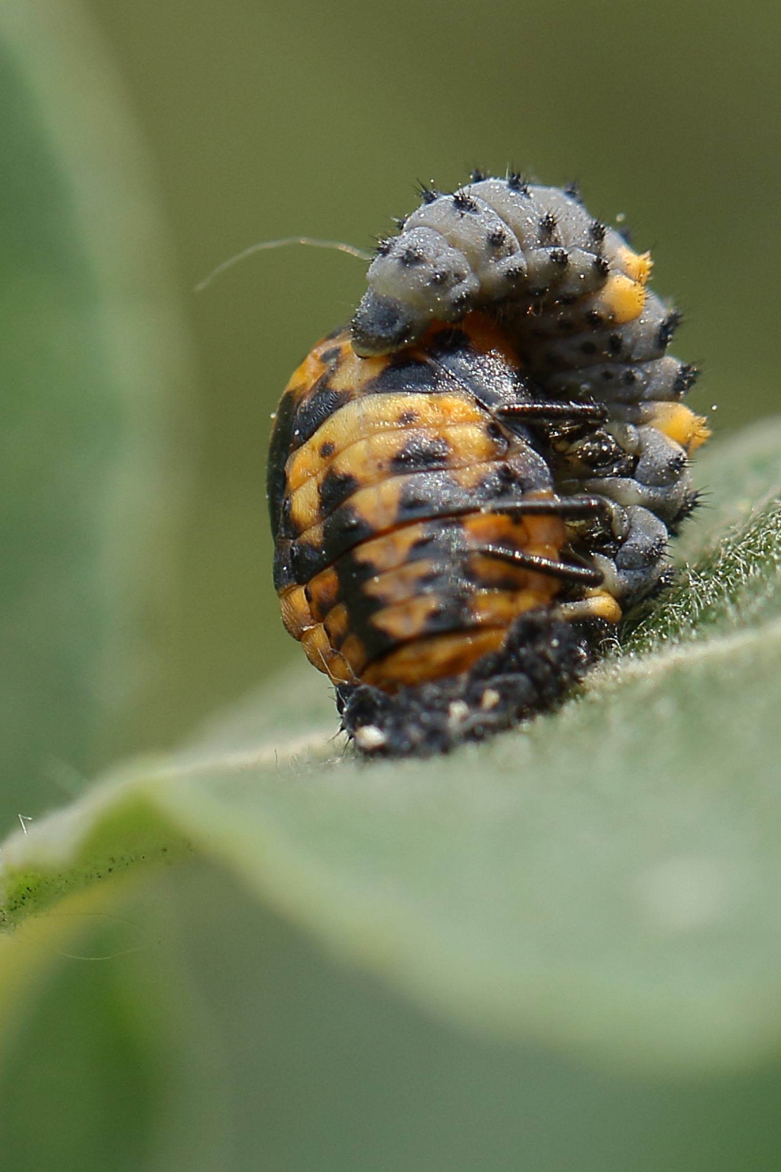 de larve van het 7-stippelig lieveheersbeestje verandert in een pop