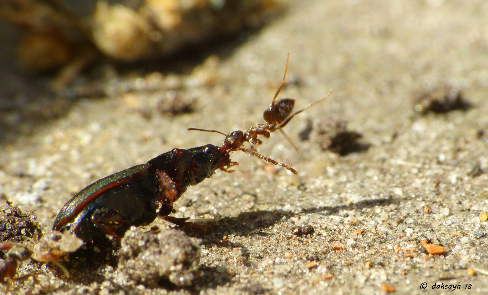 Een aantal mieren hebben een loopkever (waarschijnlijk zo goed als dood) te pakken en proberen die weg te slepen naar hun nest.
