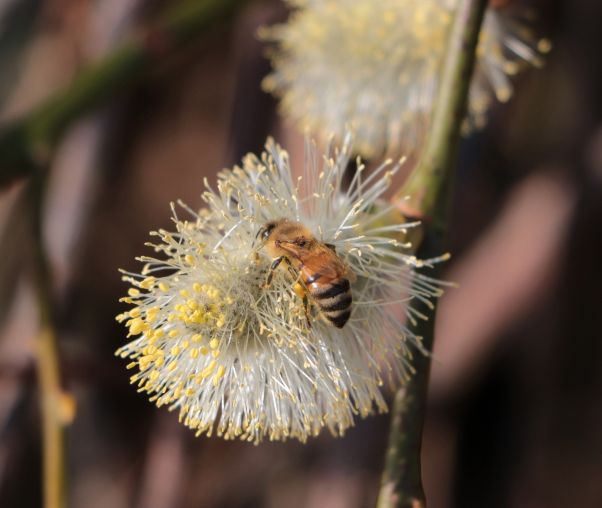 Vanochtend, onderweg naar het dorp, kwamen we langs deze wilgenkatjes. Enkele bijen waren druk bezig. Deze liet zich mooi op de plaat vastleggen.