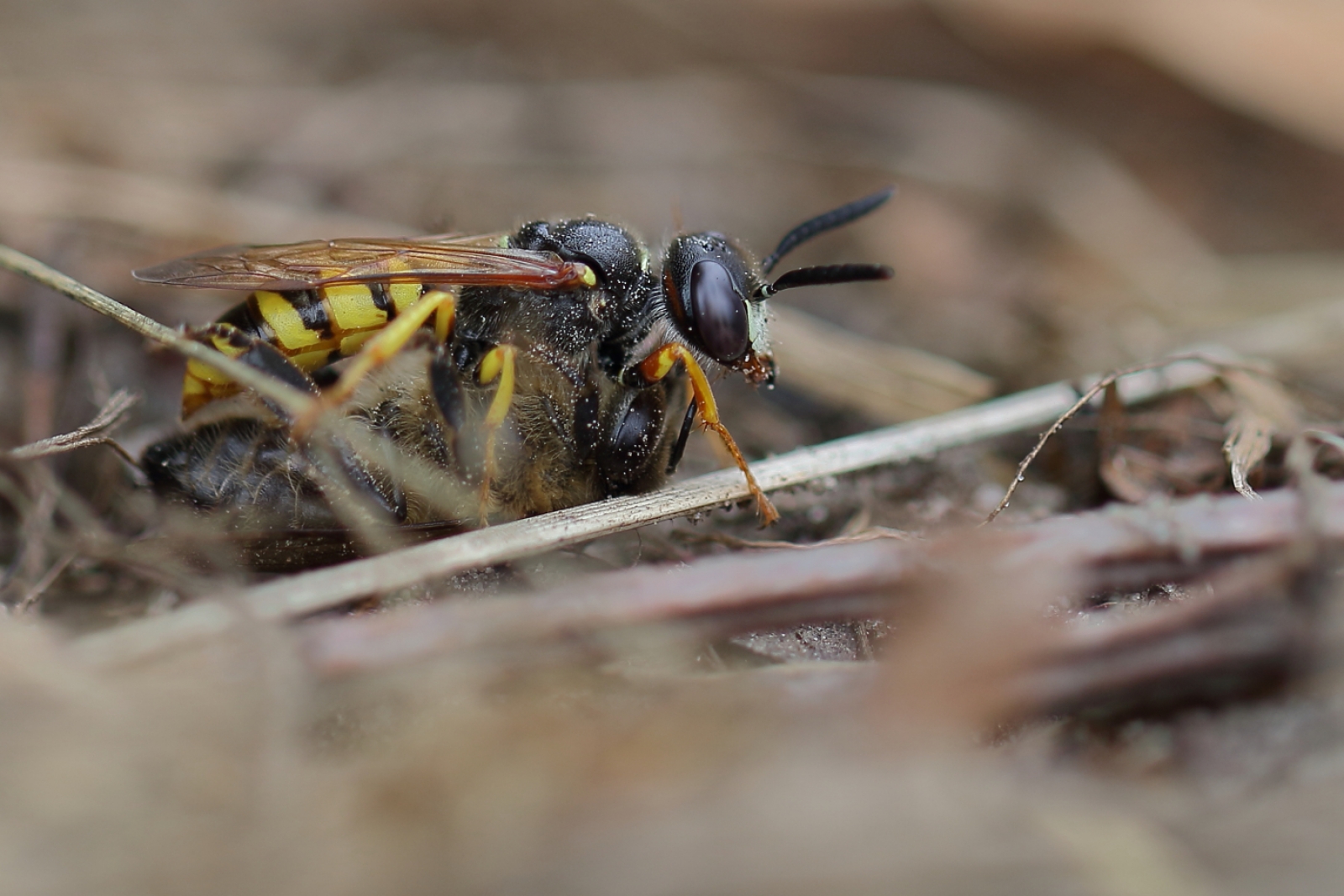 Op een zandpad zagen wij deze bijenwolf druk in de weer met het graven van een nest. Vele uren later passeerden we hetzelfde punt en zag ik bij toeval ‘’iets groots vliegen’’. Vlakbij de ingang van het eerder gegraven nest landde de bijenwolf met prooi: de honingbij. Thuisgekomen zocht ik iets op over het leven van deze wesp. Voor wie meer wil weten, zie details hieronder: