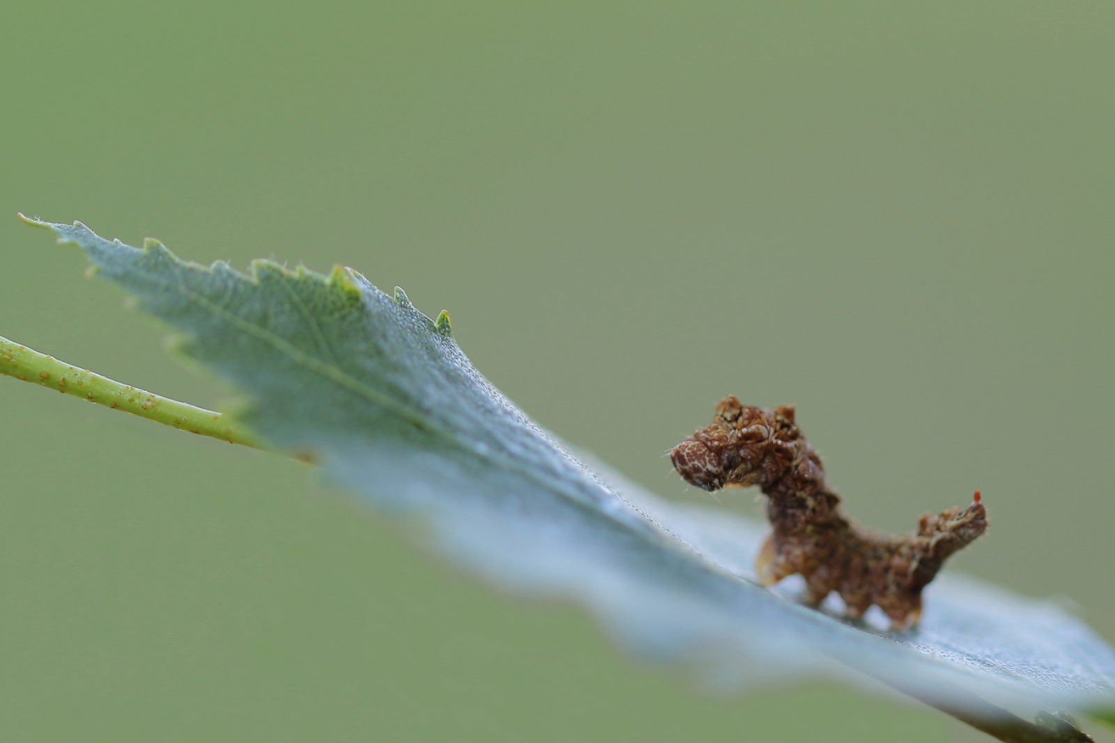 Het lijkt net op een hondje in miniformaat maar het is de rups van een nachtvlinder: de bleke eenstaart. Hier zit de kop van de rups links en de gepunte staart rechts.
