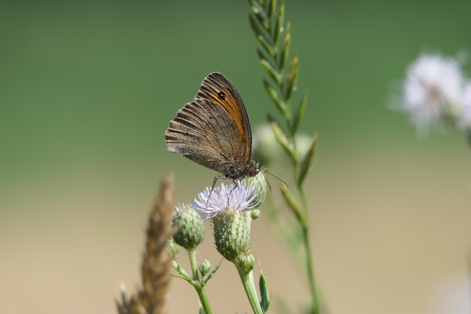 Een prachtig bruin zandoogje op een distel. Een geliefde plek voor zandoogjes.