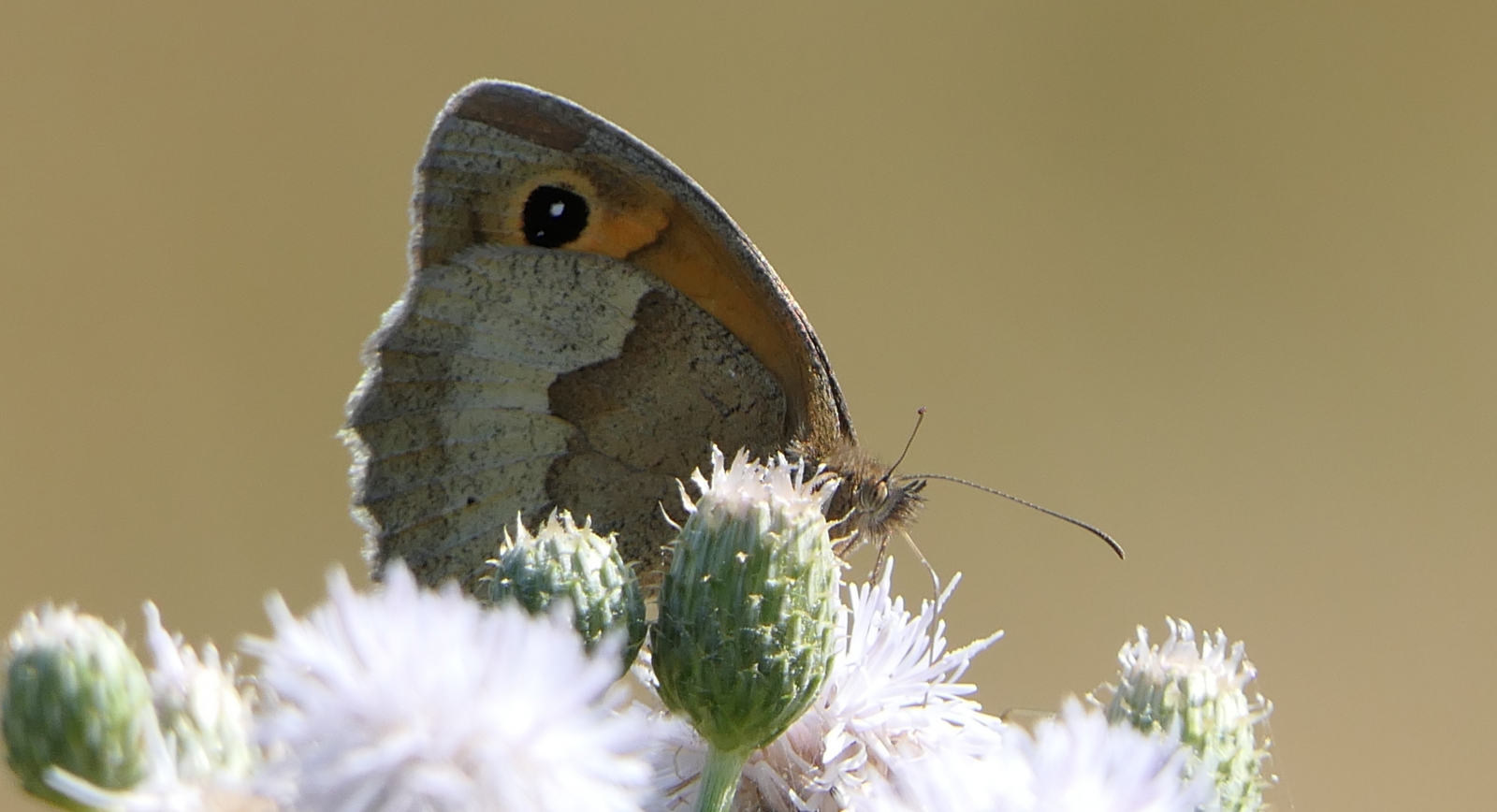 Een bruin zandoogje op zit heerlijk in de zon. Een prachtig moment.