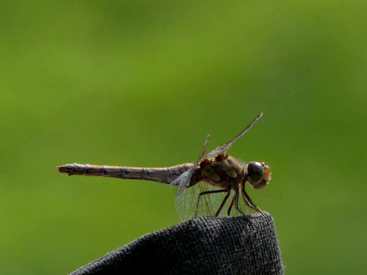 Deze libel had een voorkeur voor de stoelkussen. Een reactie op deze foto bracht de libel op naam: Bruinrode heidelibel. Bedankt, dat is dan een nieuwe tuinsoort.