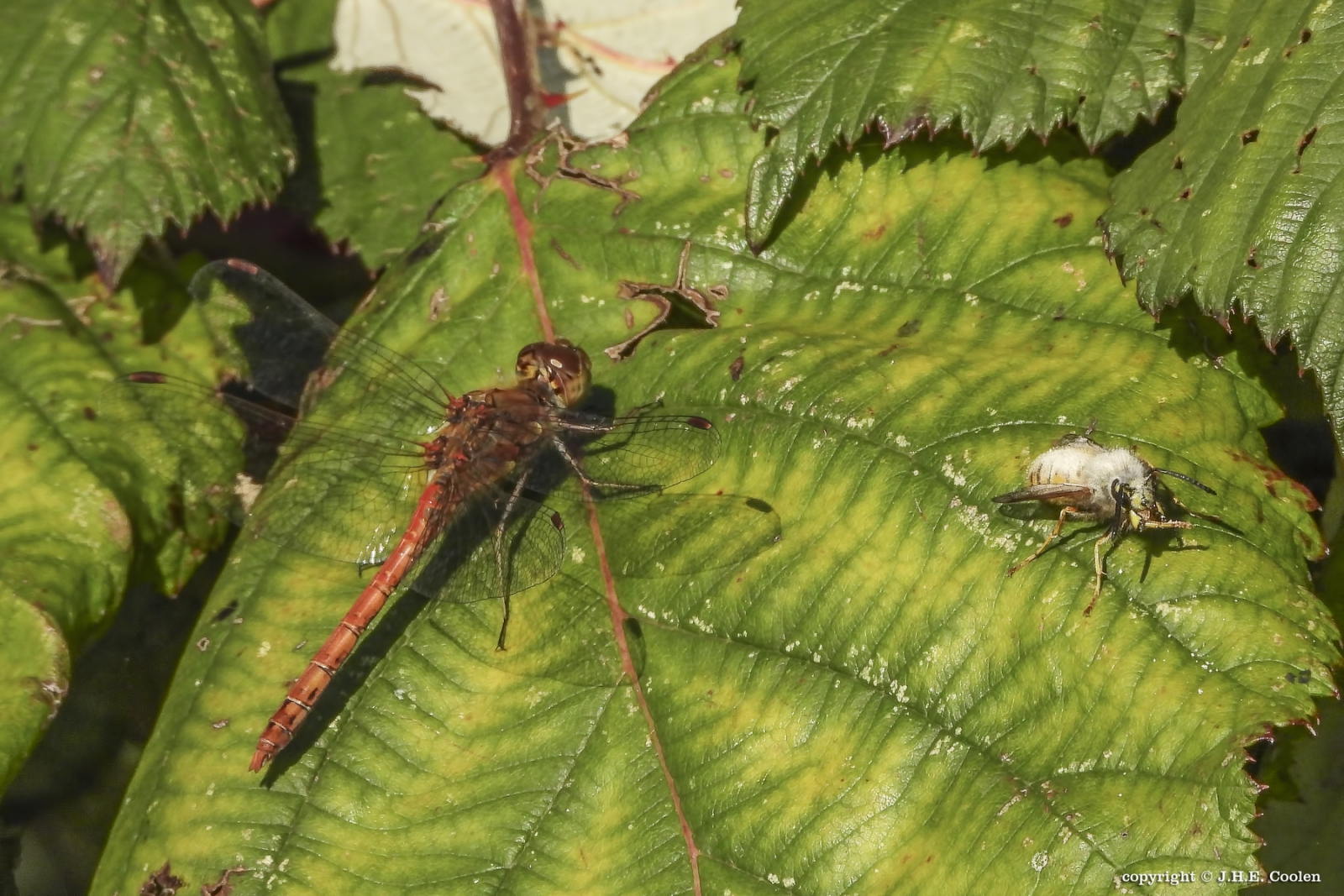 De een aan de schoonmaak (wesp), de ander om warm te worden (bruinrode heidelibel). P1000. Gr. Jan