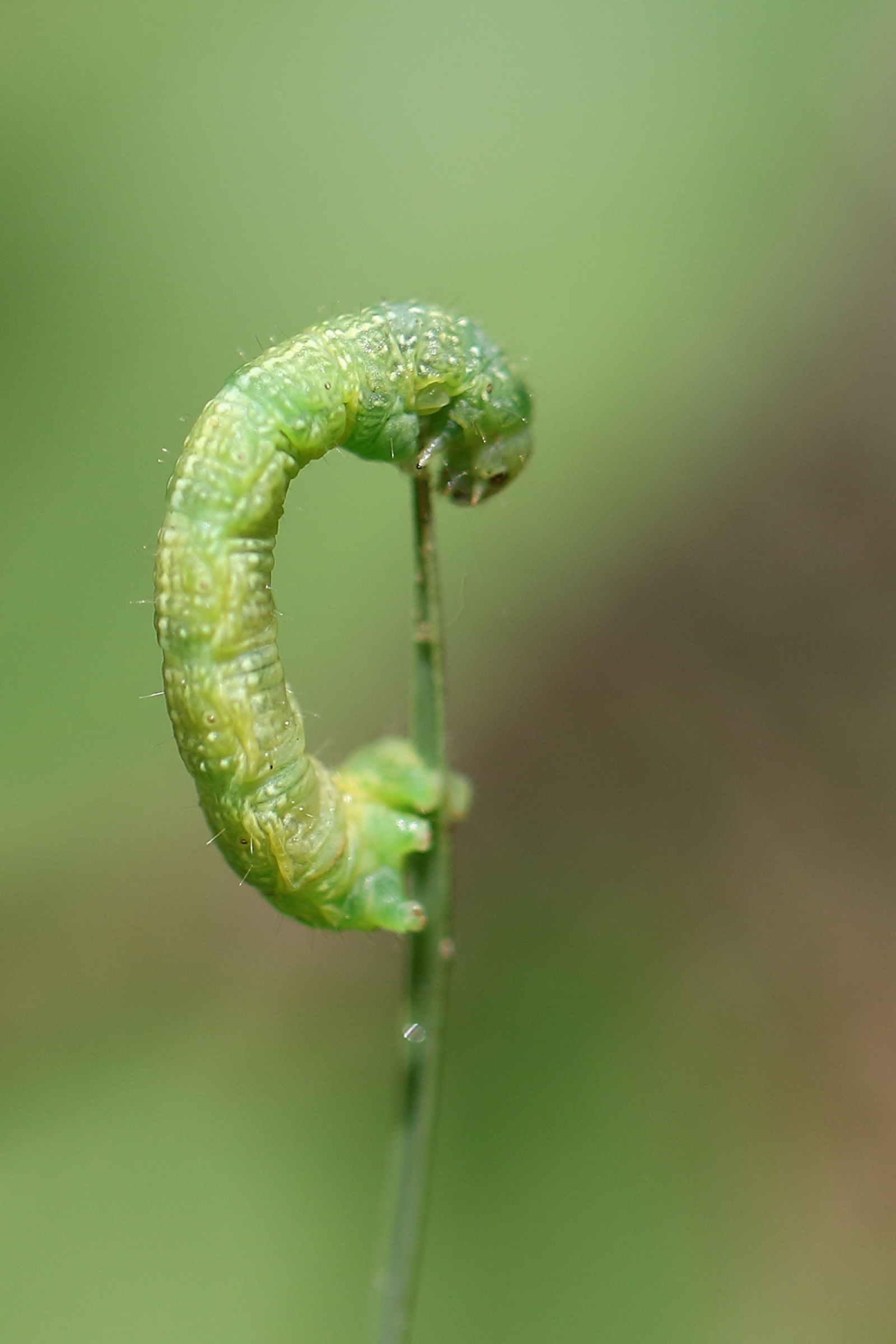 rups van de kleine wintervlinder -onzeker- probeert op alle mogelijke manieren bij het volgende grassprietje te komen