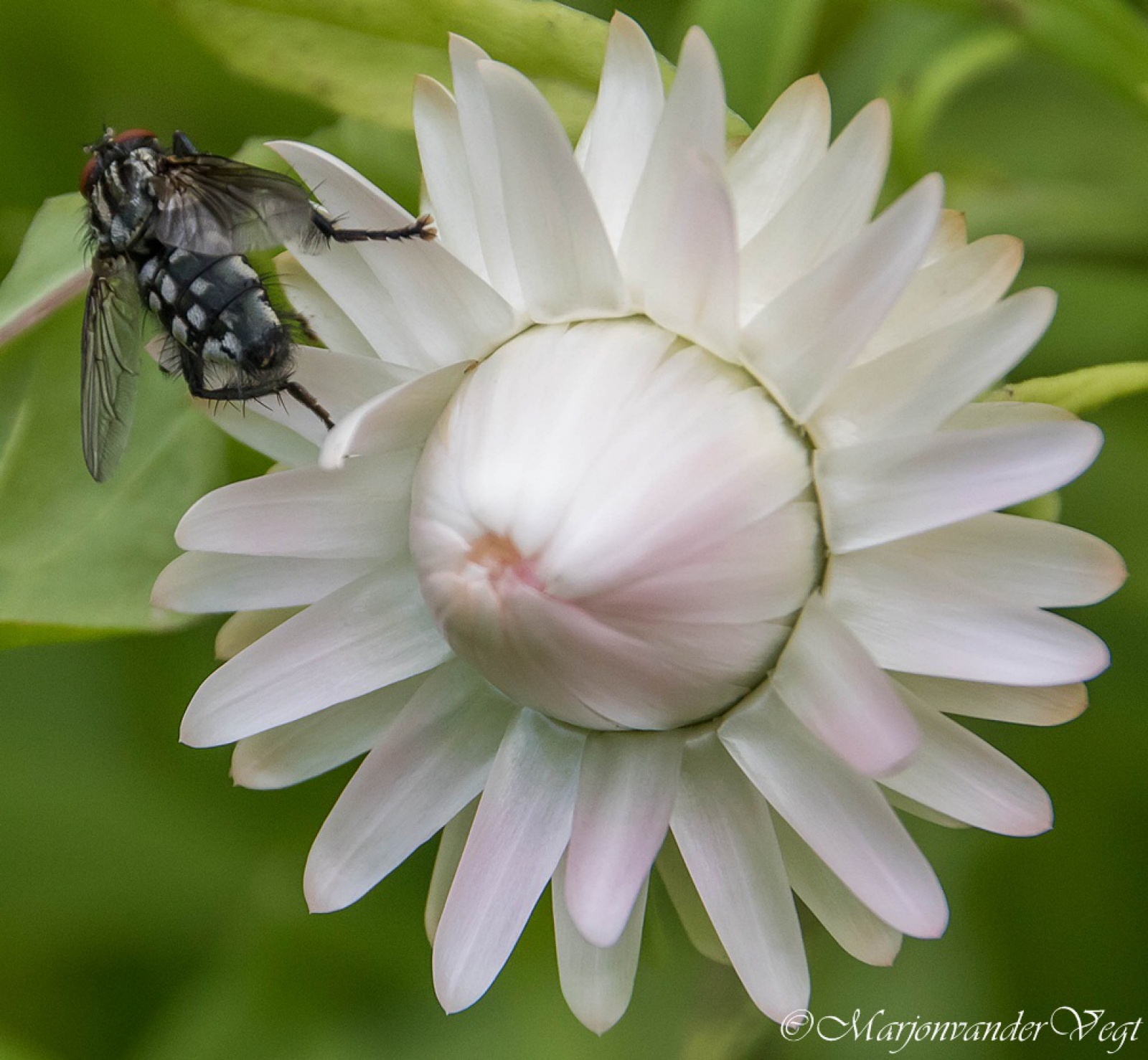 Prachtige fotocombinatie van droogbloem en vlieg Marjon.