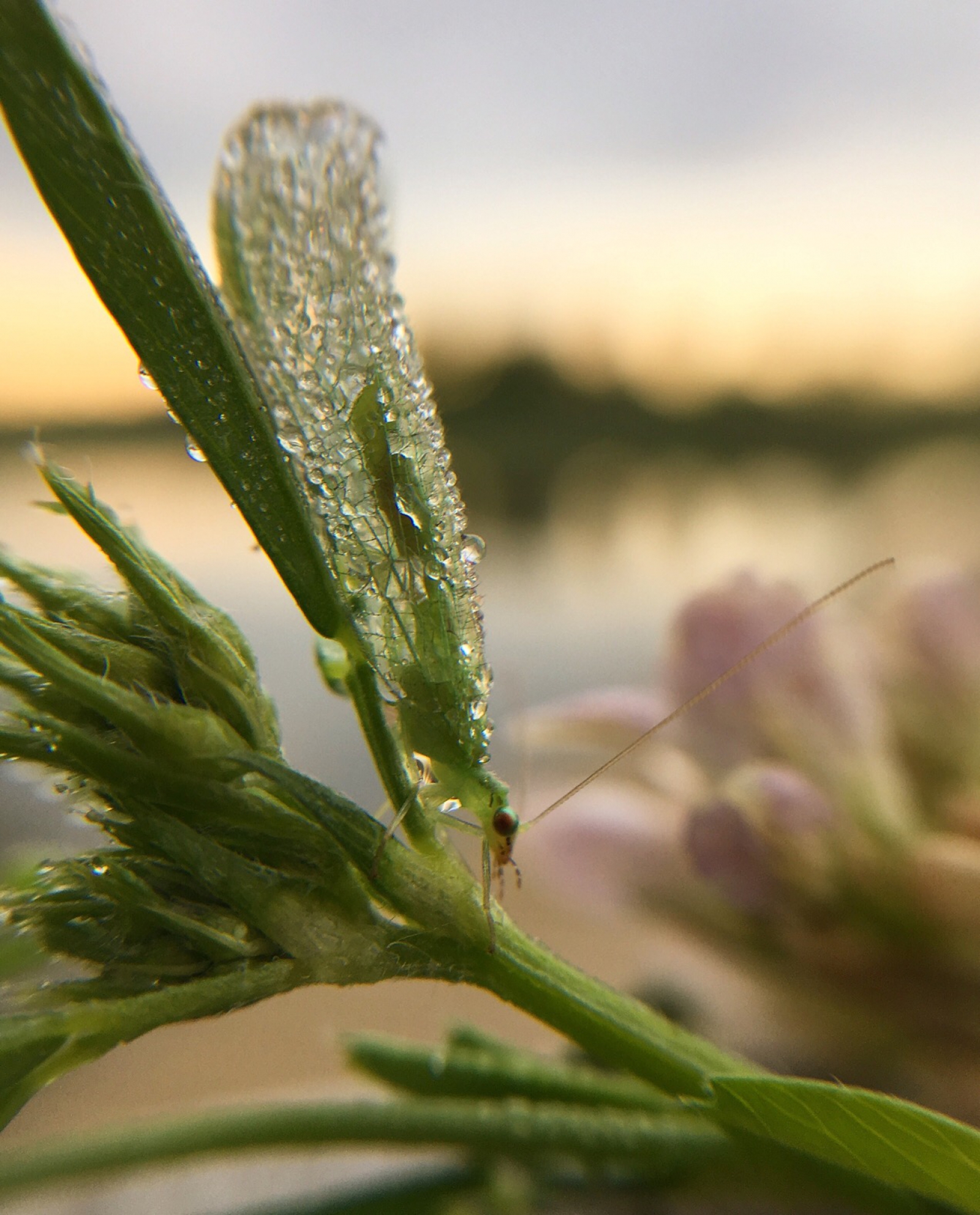 Ik weet niet wat het voor insect is maar hij zat onder de dauwdruppels Hij was niet te zien tussen het groen het is dat hij bewoog anders had ik hem niet gezien