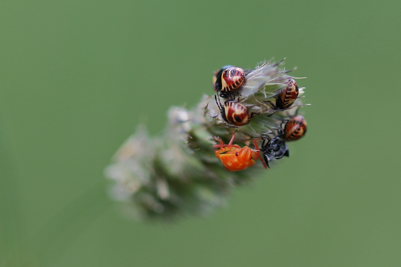 Er gebeurt hier van alles…. Bovenop -links en rechts- zijn nimfen van deze schildwants. De knaloranje schildwants onderop is van dezelfde soort maar net verveld. Het zwarte ‘’dingetje’’ ernaast is het vervellingshuidje.