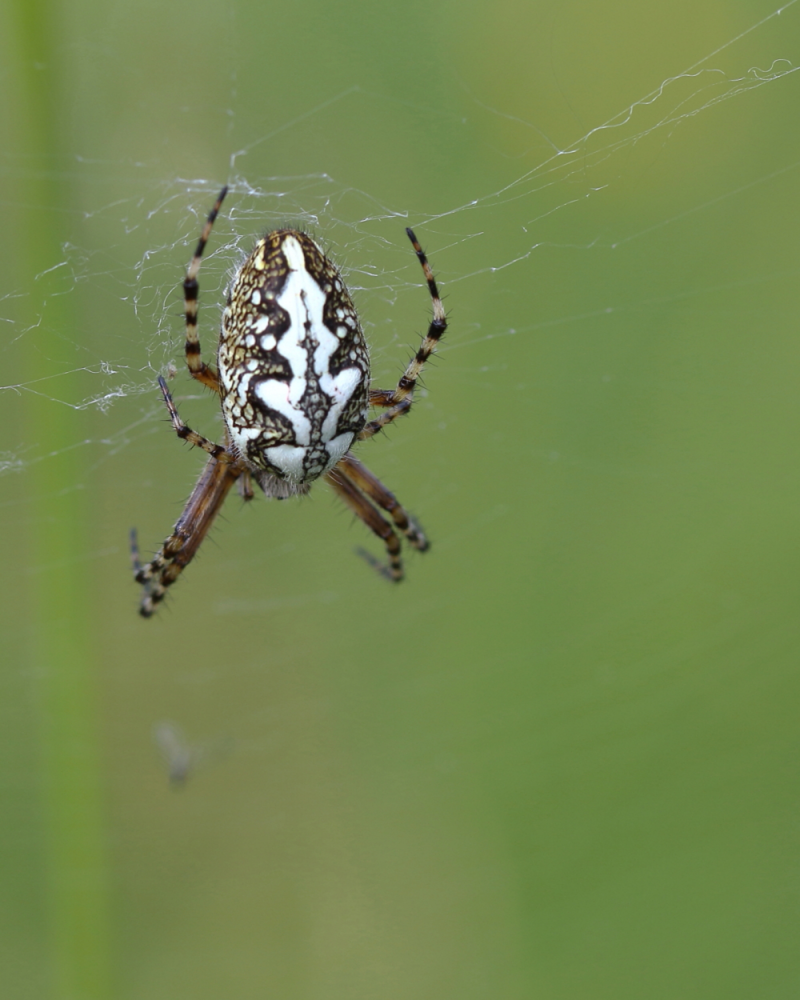 Net over de grens in Duitsland fotografeerde ik deze zeer zeldzame eikenbladspin. Aan de rug-tekening is goed te zien waaraan deze spin zijn/haar naam ontleent. Deze spin is familie van de kruisspin maar wordt ook wel wielwebspin genoemd.