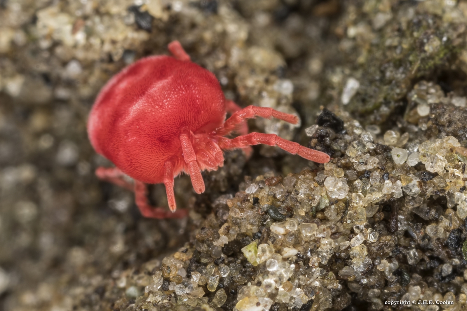 Pf met deze mooie rode mijt! Aan de zandkorrels is te zien hoe klein zij/hij is.