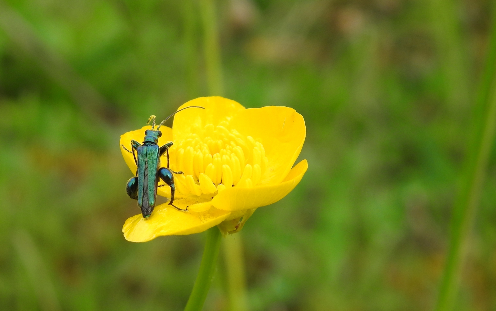 Met die dikke dijen denk je toch eerder aan een stevige dame, maar nee, het is hier het mannetje van deze keversoort. Hij is een frequente bezoeker van diverse bloemsoorten, waar hij zich voedt met stuifmeel en nectar. De larve ontwikkelt zich in dode stengels van kruidachtige planten.