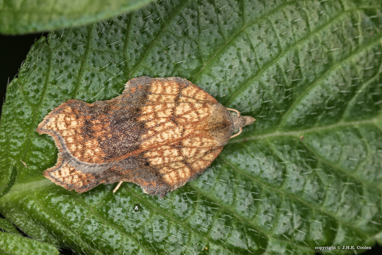 Jan, Ik kom hem tegen als Gehakkelde bladroller Acleris emargana bij Bladrollers Microlepidoptera.nl