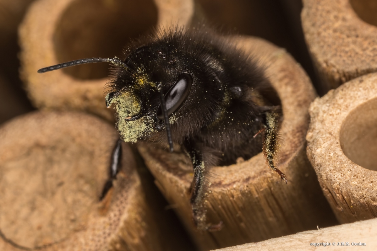 De Gehoornde metselbij is een vrij algemene bijensoort die haar nest in allerlei holle ruimtes maakt. Ze is dan ook gemakkelijk in bijenhotels aan te treffen.
