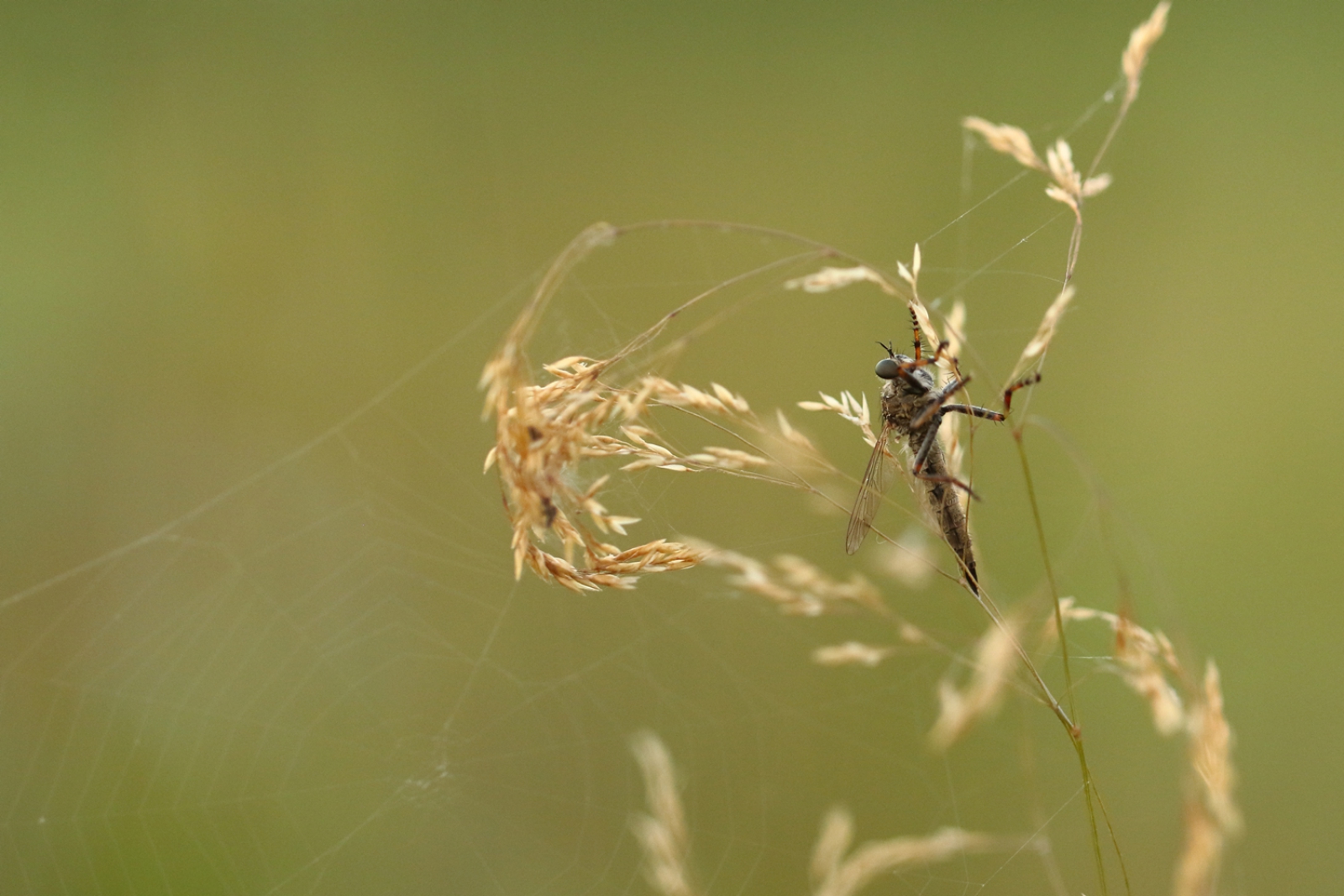 De watersnuffel die ik wilde fotograferen werd op het nippertje gemist door deze ringpootroofvlieg [v].