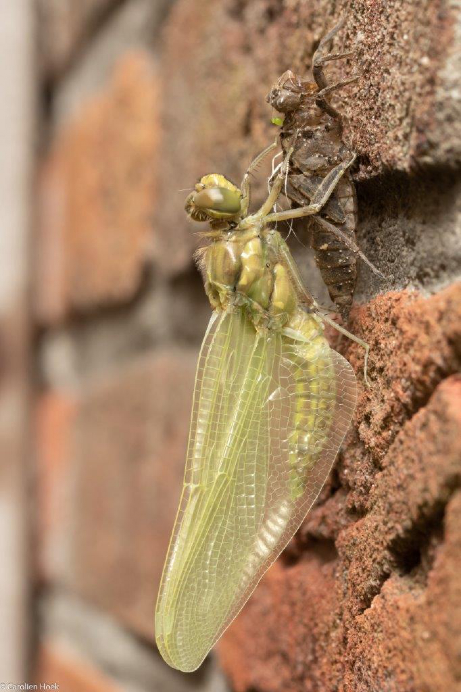 Donderdag mogen zien hoe een Gewone Oeverlibel, die net uit zijn larvelijf was gebroken, zijn vleugels uitvouwt en "op pompt" om vervolgens weg te vliegen. Dit is de eerste foto uit een serie van 4.