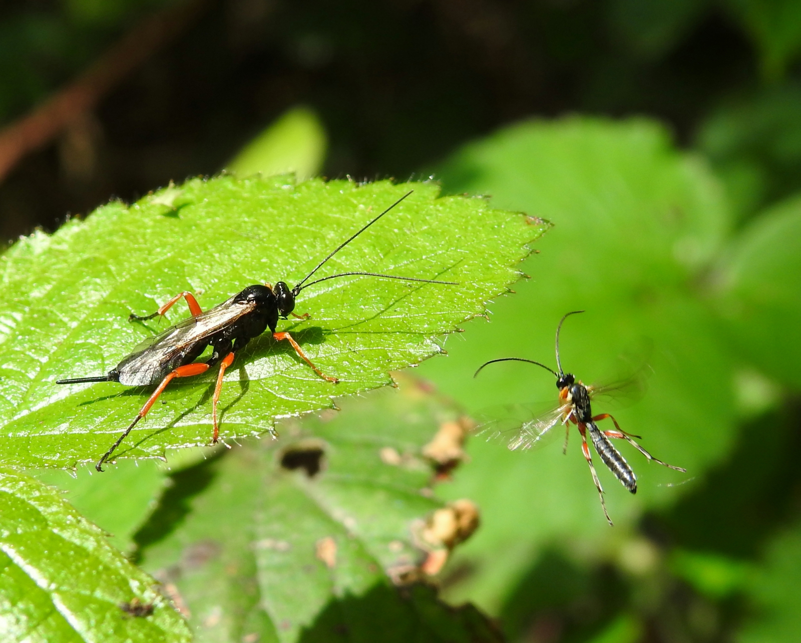 Goede foto en leuk dat er nog een mooi insect in beeld vliegt!