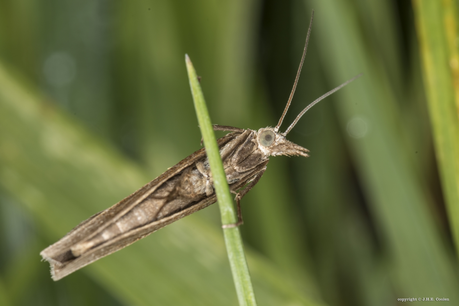 Als ik een grasmot spot en vang zit deze veelal met gesloten vleugels naar de stengel te staren en is dan niet te onderscheiden van andere" grauwe" motjes laat staan dat ik deze in zijn (blauwe) ogen mag staren.