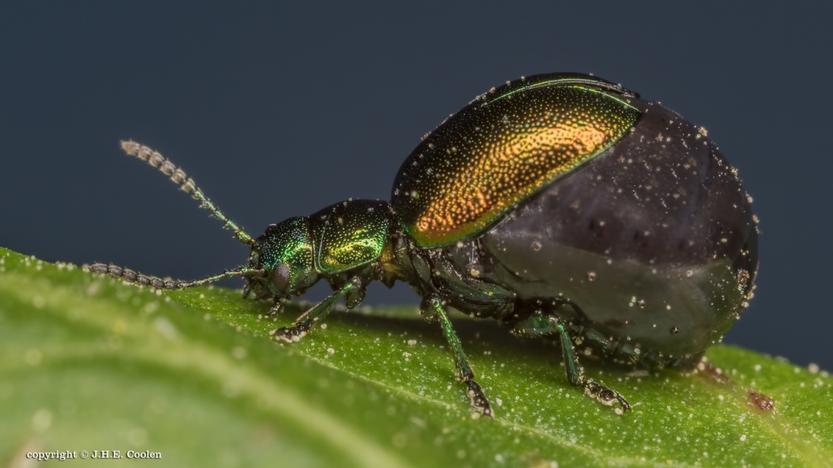 Heel veel kleinere bladhaantjes zijn blauw, zwart of groen. Maar afhankelijk van het licht weerkaatsen ze allerlei kleurtjes. De meeste beestjes moeten ontleed worden om de exacte soort vast te stellen. Maar er is een andere mogelijkheid: kijken naar de voedselplant waar de larven op leven. In dit geval was dat een zuring-soort. En dan is het gemakkelijk: dit is het groene zuringhaantje. De larven kunnen zich alleen maar ontwikkelen op zuring. Het groene zuringhaantje is een metallic groen bladhaantje. En niet alleen de dekschilden zijn metallic groen, ook de pootjes. De vrouwtjes zijn met een lengte van 7 mm aanzienlijk groter dan de mannetjes die slechts 3 tot 4 mm groot worden.
