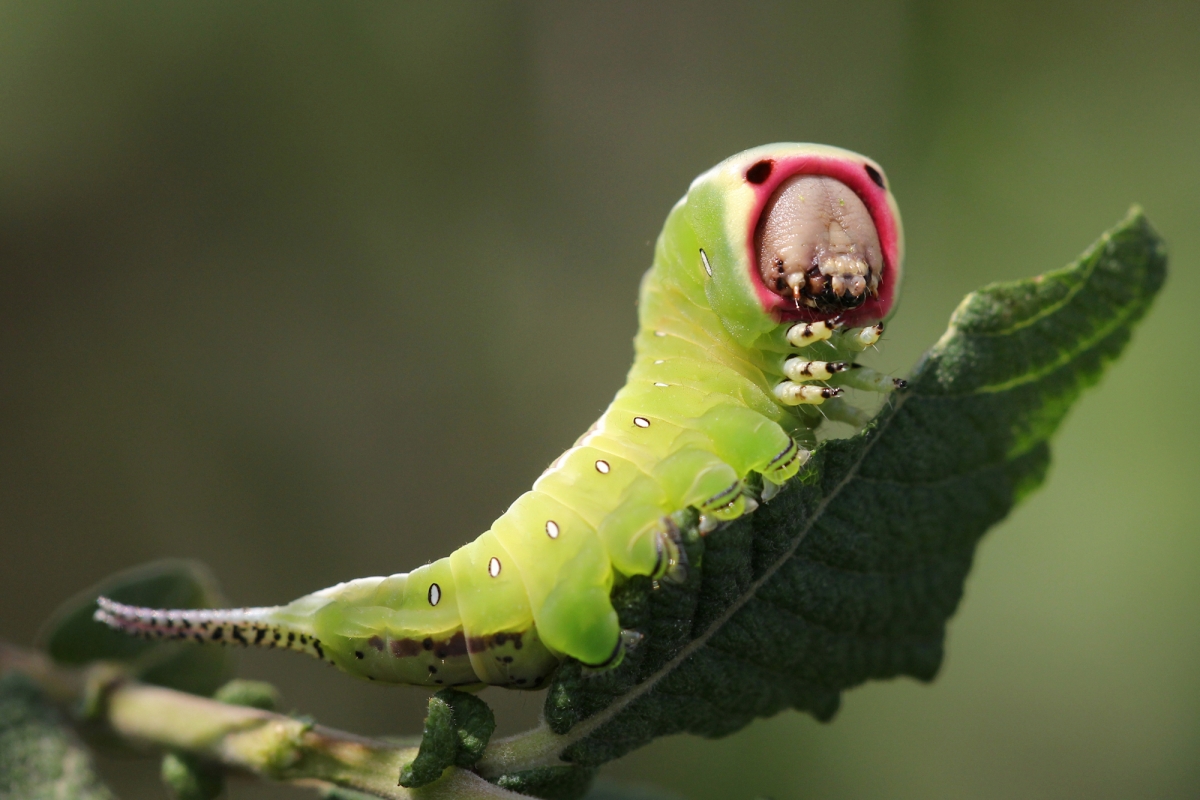 De volwassen rups (zo'n zeven centimeter), zes voorpootjes wat later de échte pootjes van de vlinder zijn, de rode afschrikrand om de kop en de namaak ogen, zwarte stippen, zichtbaar. Ook de hulppoten zijn te zien. Alleen de naschuivers (veel rupsen hebben die achteraan het lijf), zijn gemodificeerd in twee op staartjes lijkende uiteinden. Zodra er verstoring of dreiging is, trekt de rups z’n kop naar binnen in de rode rand en perst twee rode “draden” uit de staartjes en zwiept daarmee. Nog steeds gevaar? Dan kan hij uit een spleet onder de kop een stof spuiten, om bang van te worden …