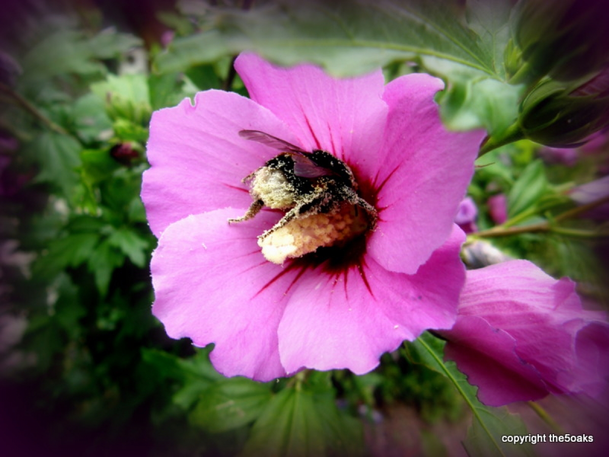 druk bezig om nectar te verzamelen en ondertussen overdekt met stuifmeel.