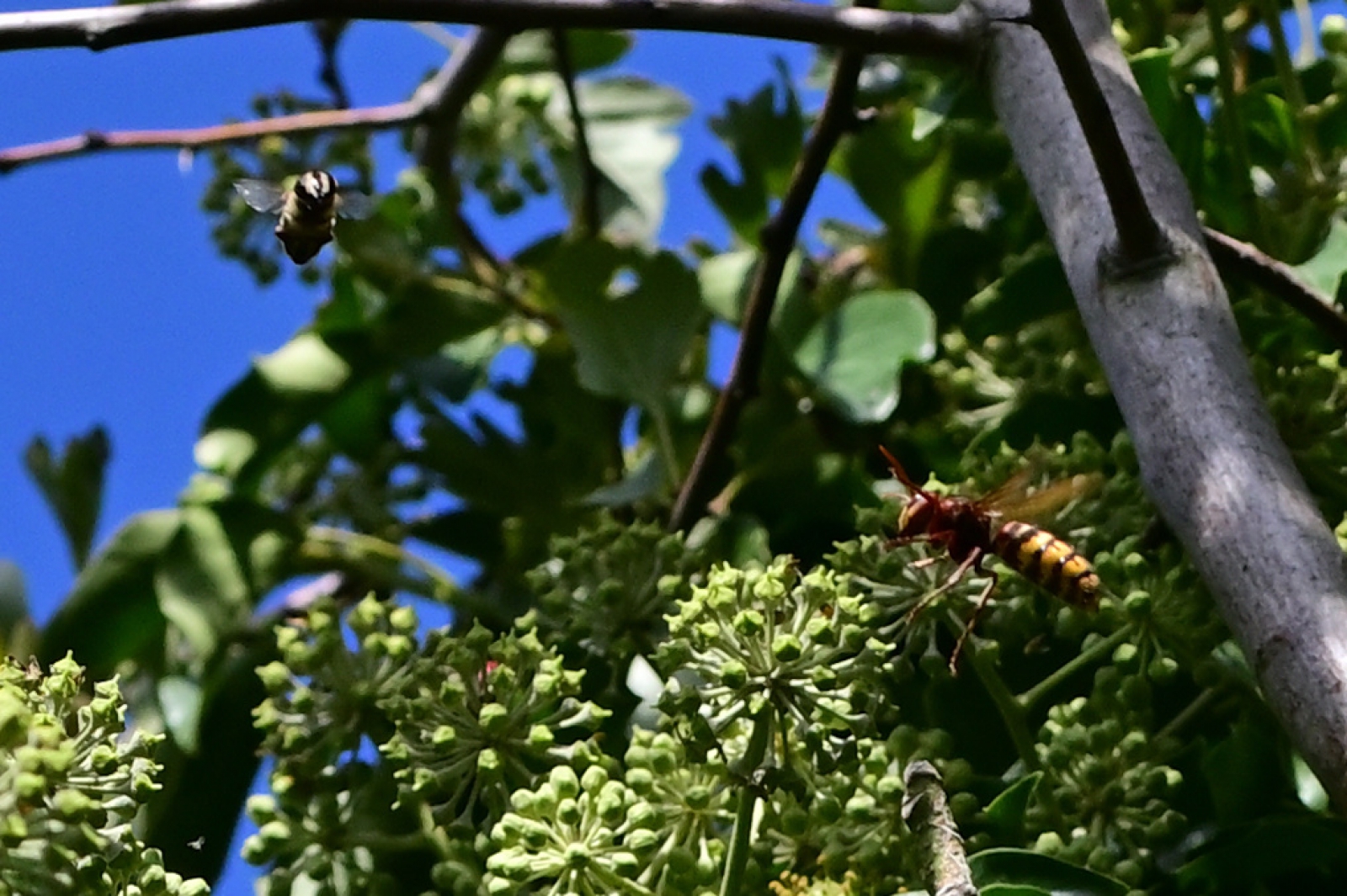 Een Hoornaar patrouilleert rondom bloeiende klimop op zoek naar een lekker hapje.