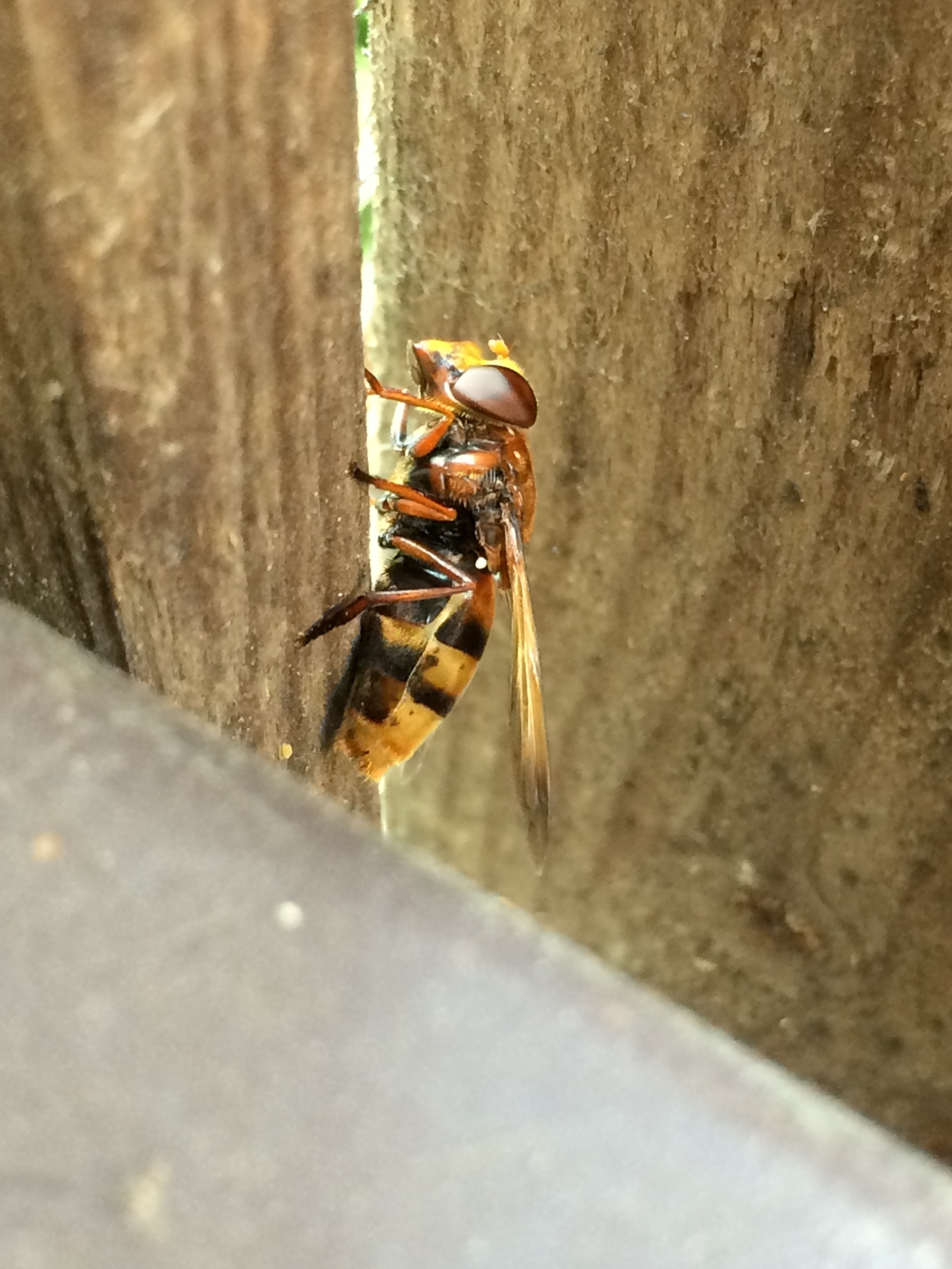 Dit insect zagen we vanmiddag bij ons huis. In eerste instantie dachten we aan een hoornaar, maar op een gegeven moment kwamen we tijdens het zoeken op internet uit op een hoornaarzweefvlieg. En wij (leken) zagen toch meer overeenkomsten met de hoornaarzweefvlieg.