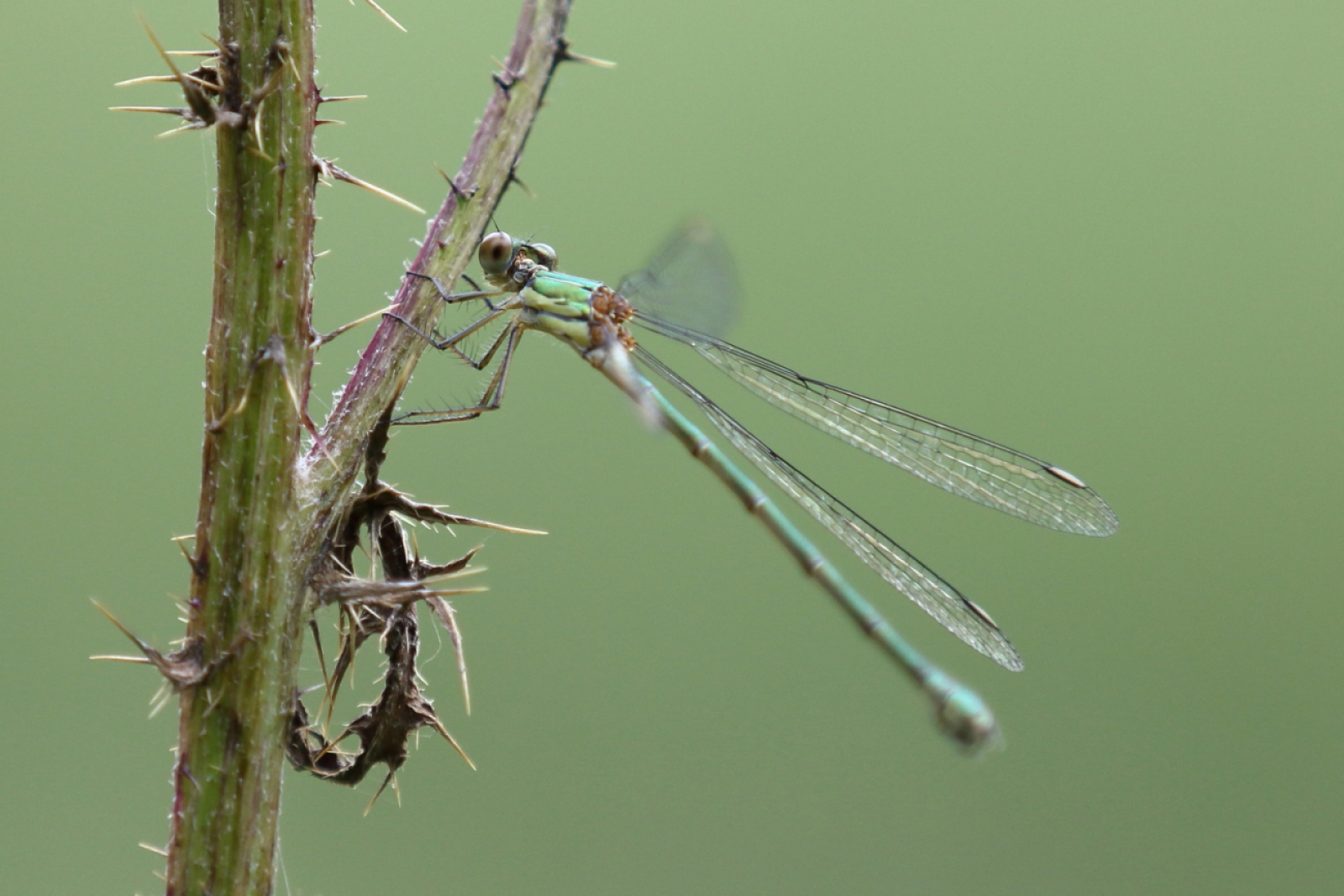 deze houtpantserjuffer [v] neemt wel risico om op zo'n stekelig takje te landen