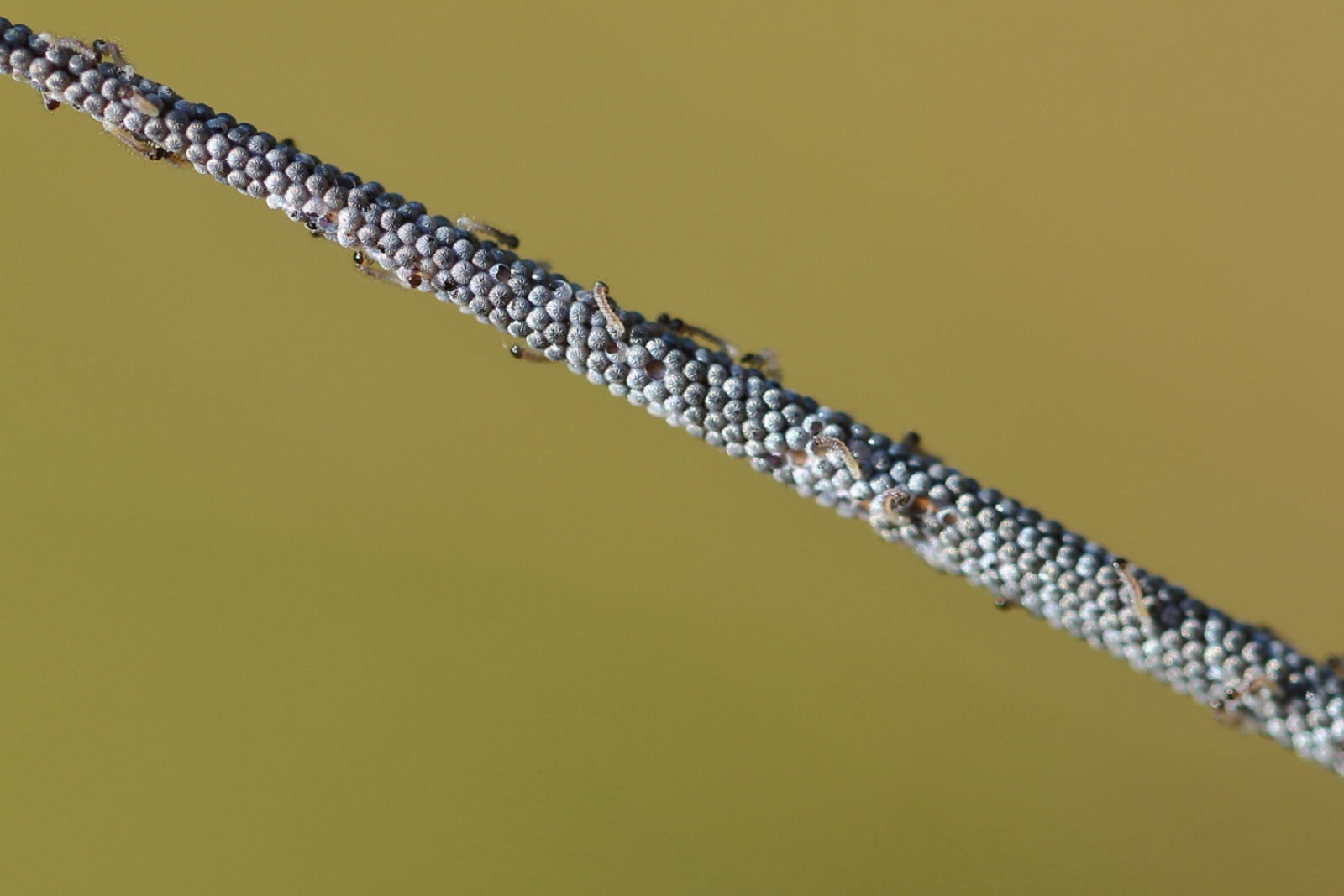 De huismoeder is een nachtvlinder. Op deze foto zijn de eitjes en enkele uitgekropen rupsjes te zien. Er is ook een witte variant; deze eitjes zijn jonger en bijv. de nacht ervoor gelegd.