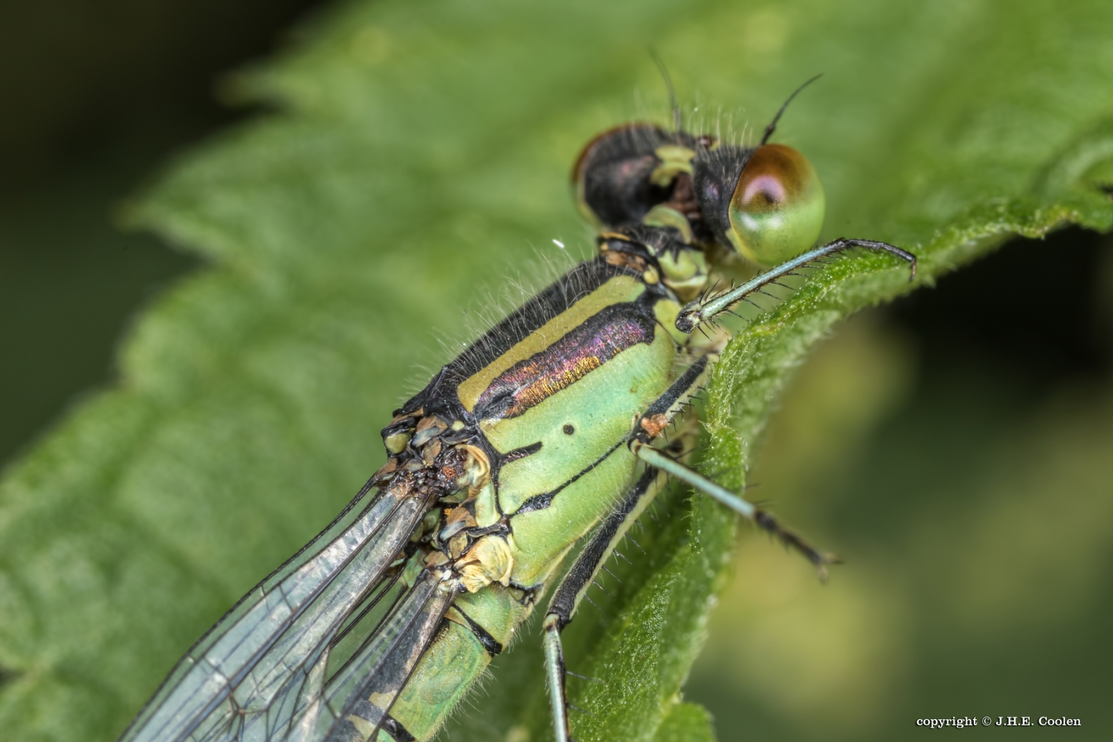 Juffer, de ogen uit elkaar, vleugels in rust, achter op het lichaam.
