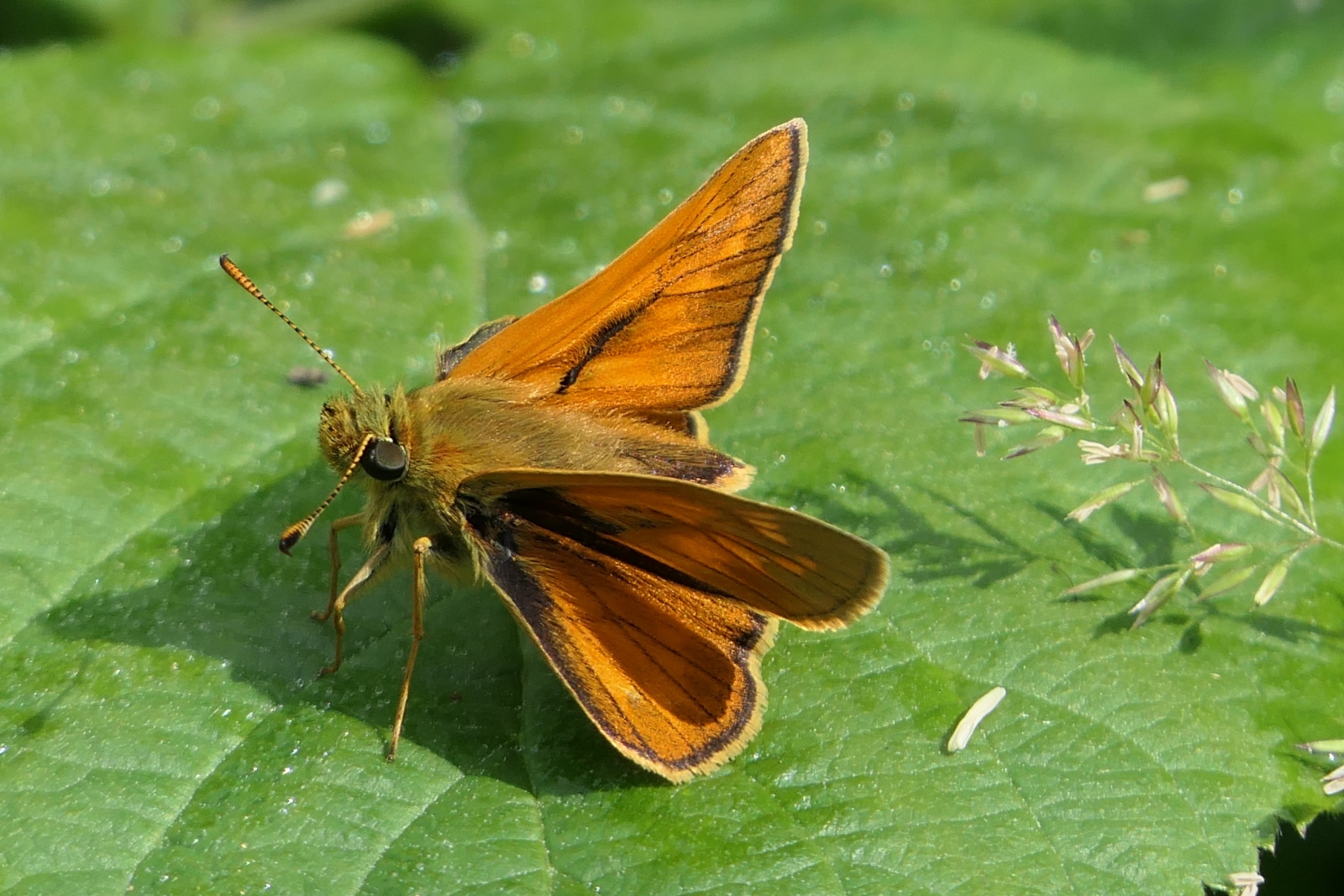 Prachtig Klein dikkopje op een bramenblad in de zon.