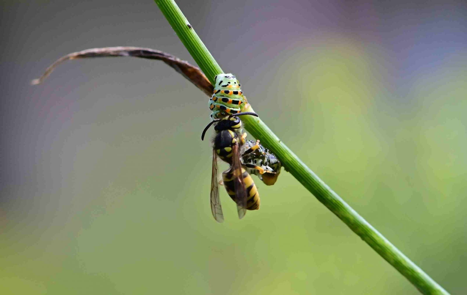 Jarenlang heb ik me afgevraagd waar de rupsen van Koninginnenpages op Venkel bleven. Ze verdwenen telkens voordat ze aan verpopping toe waren. Ik dacht aan predatie door vogels, maar bijgaande foto laat zien dat wespen de "boosdoeners" zijn. De rups werd in stukjes geknipt en afgevoerd.