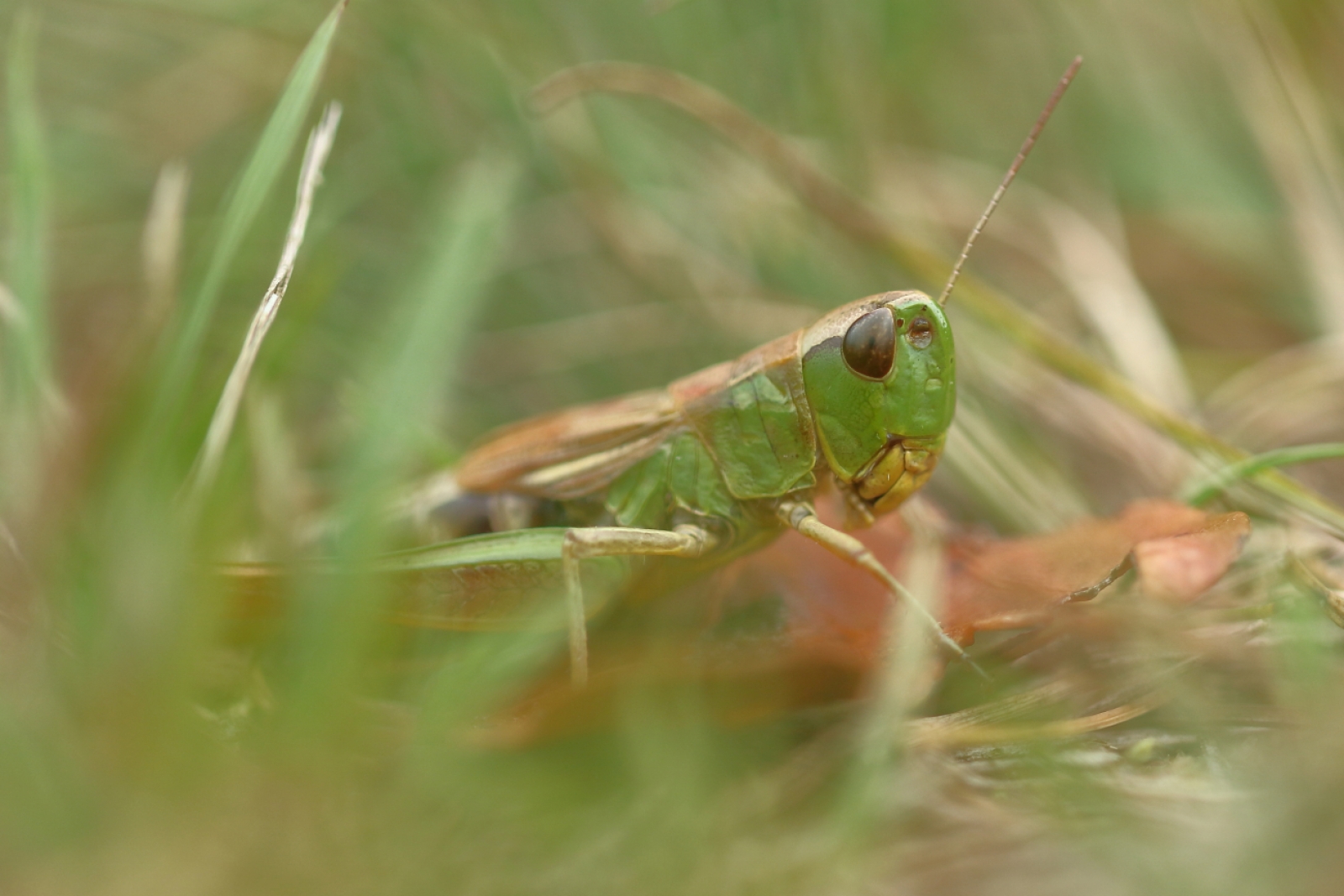 Deze krasser heeft nog maar 1 spriet. Navraag leert dat dit aan het einde van het seizoen vaak voorkomt; ze zijn bijvoorbeeld gegrepen door een vogel, insect of door een ‘’collega’’ de grote groene sabelsprinkhaan, die als rover andere sprinkhanen op zijn/haar menu heeft staan.