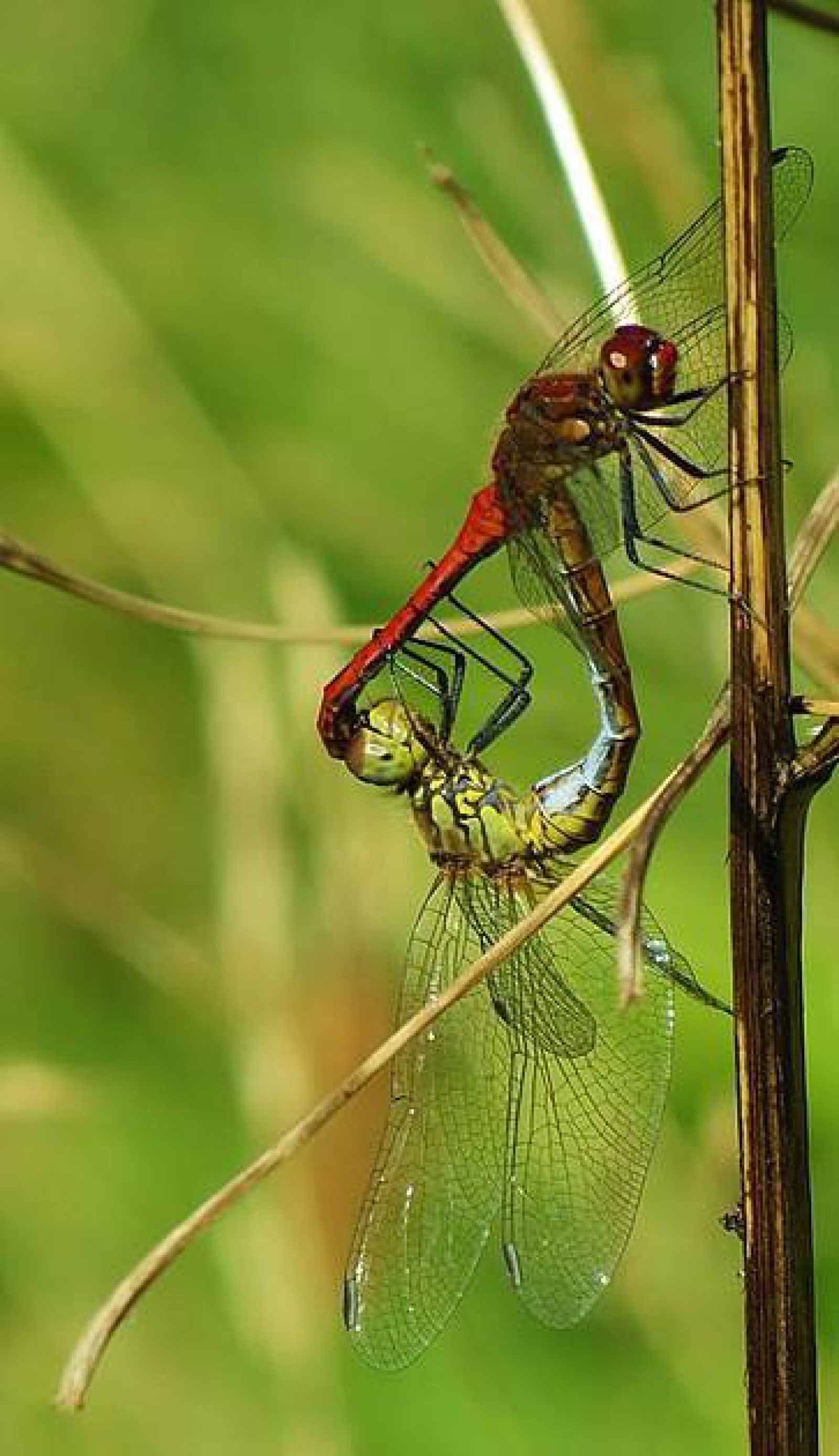 Bloedrode heidelibel (Sympetrum sanguineum), parend. De rode is het mannetje, de gele het vrouwtje.