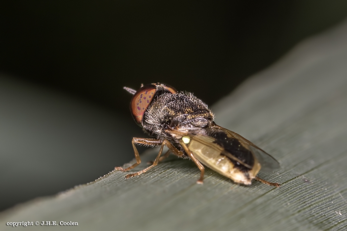 Het vrouwtje van de moeraswapenvlieg schijnt puntjes in de ogen te hebben, bovendien zijn soms de moeraswapenvlieg niet groen maar geelachtig, hier twee in één. Gr. Jan
