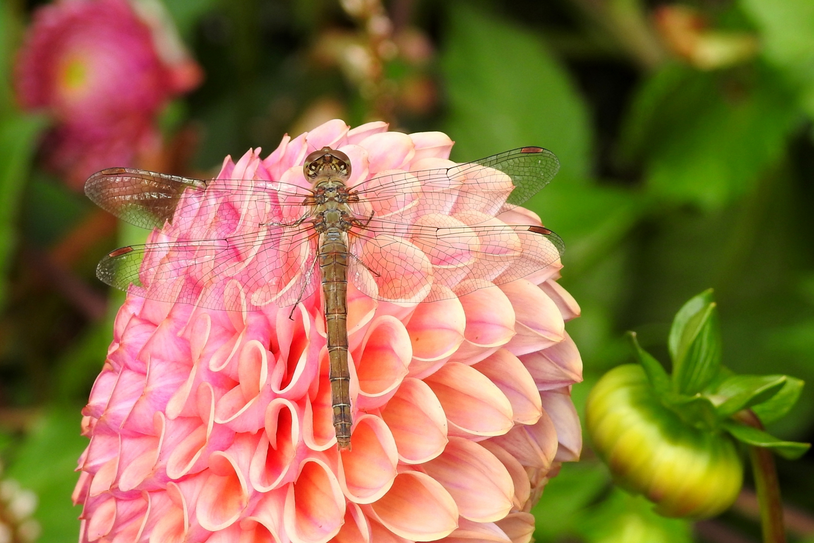 Mooie opname van deze libel in combinatie met de Dahlia.