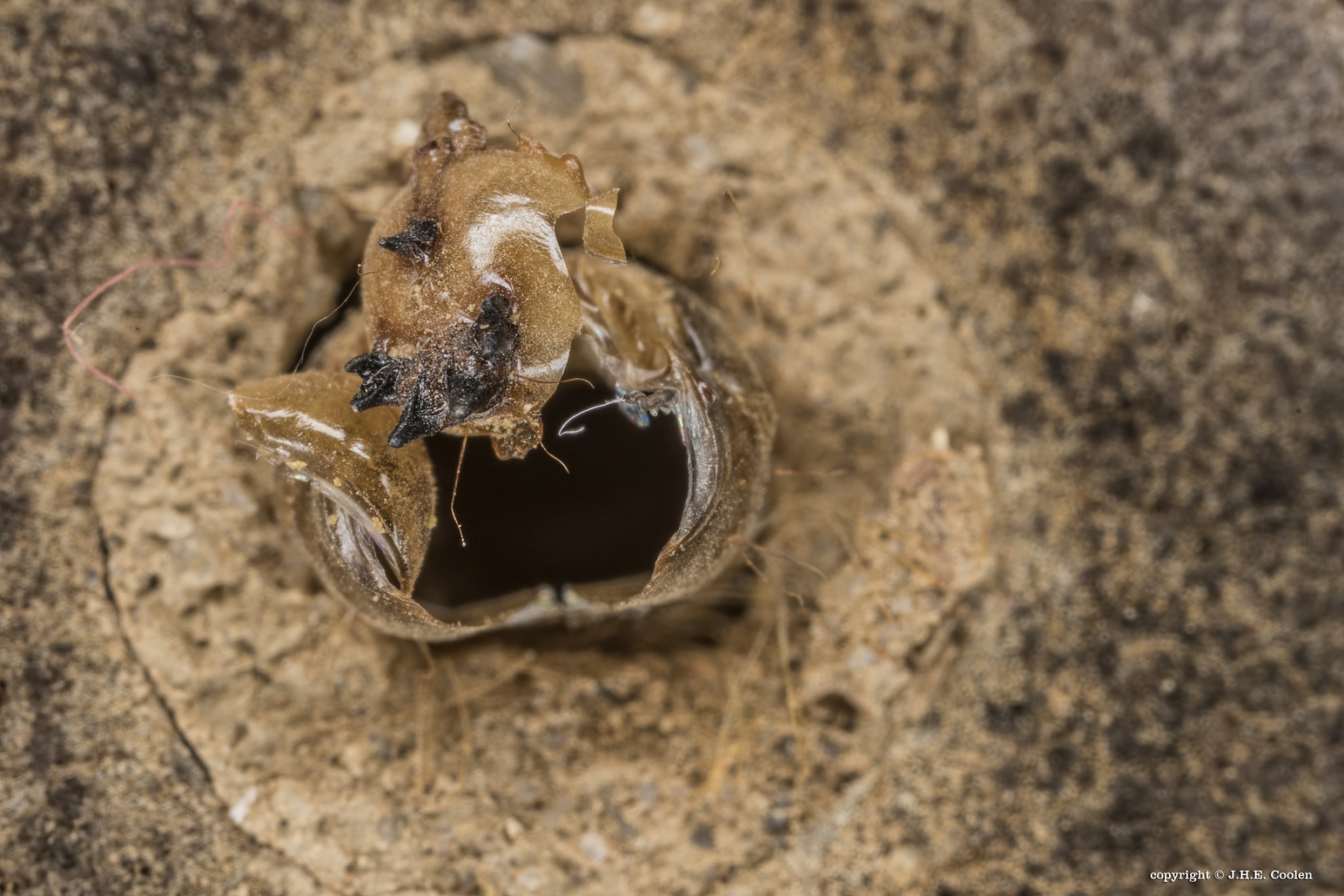 De muurrouwzwever is een typische zomersoort en juni is de periode waarin de dieren tevoorschijn komen uit de nesten van vorig jaar. Bij het zien van zo’n vers uitgekomen, en dus nog niet uitgekleurd exemplaar (foto 2), levert een korte zoektocht meestal de oude poppenhuid op die nog een klein stukje uit de nestingang steekt, zoals zichtbaar in de eerste foto. Gr. Jan