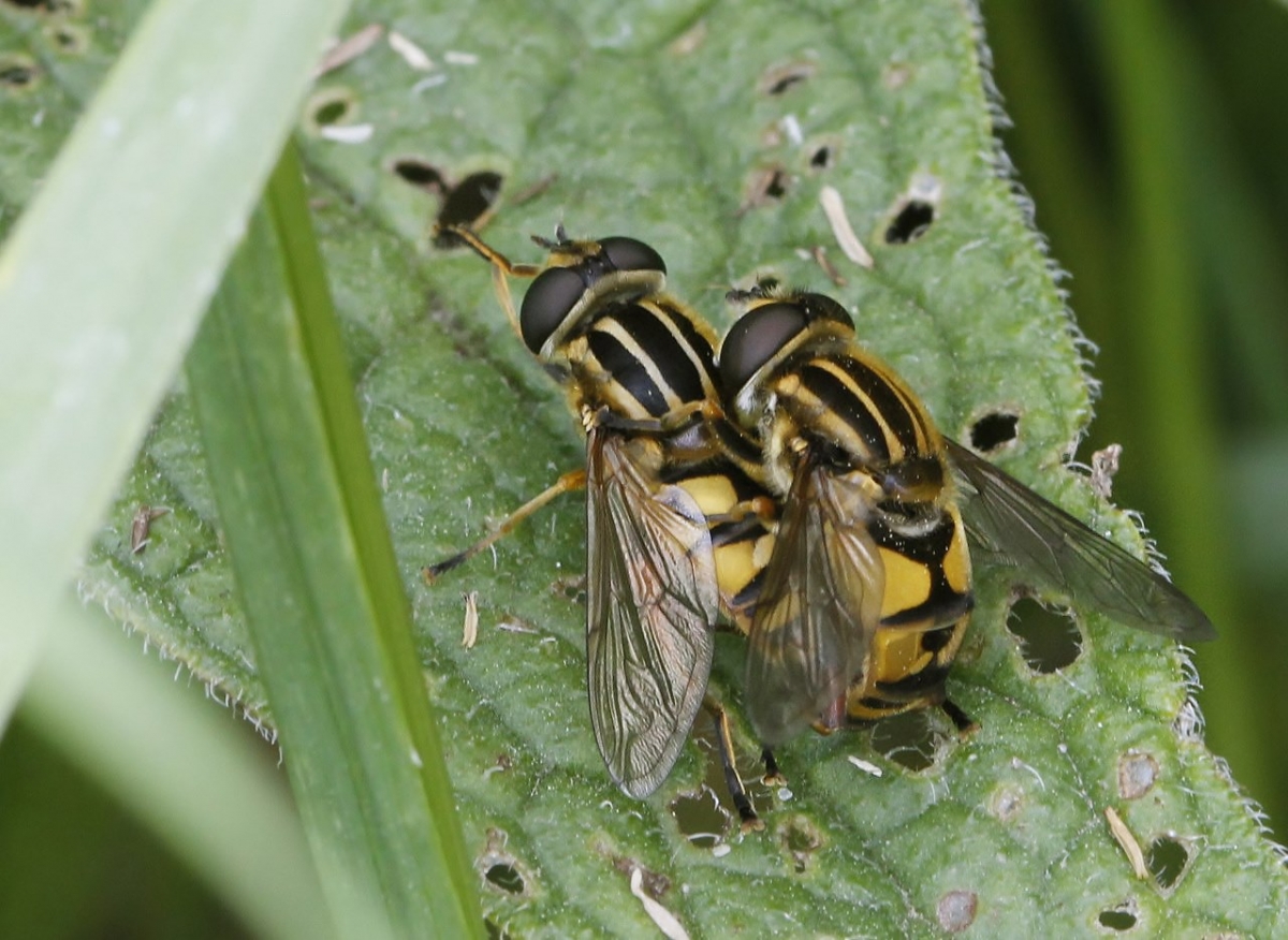 Bij de Gewone Pendelzweefvlieg is de kopstreep (onder de antennen) donker en het lijf meer oranjegeel. Ze zijn ook wat kleiner. Verder is bij die zweefvlieg eenderde deel van dij 3 geel aan de top en scheen 3 is vanaf de basis ook meer geel. Het zijn kenmerken, die in het veld moeilijk zijn vast te stellen. Een foto biedt dan soms uitkomst zonder het dier er voor te moeten vangen. Hier zijn deze zweefvliegen parend te zien. De vrouwtjes zijn iets anders getekend dan de mannetjes. De larven van deze insecten leven in verontreinigd water, waaruit zij bacteriën zeven. Bron:Zweefvliegen.