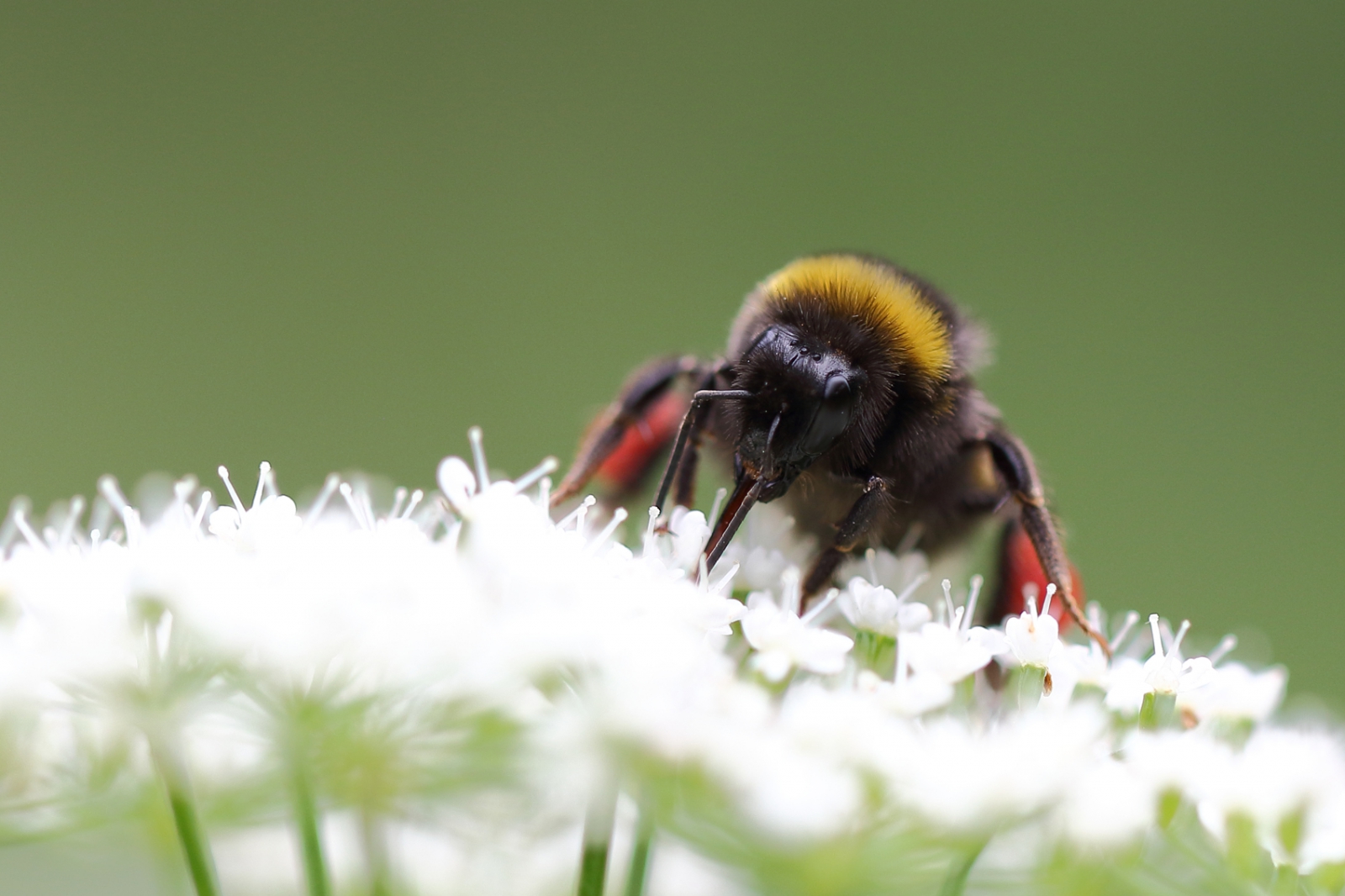 Opvallende foeragerende aardhommel met rood stuifmeel aan de achterpoten; het lijken net rode broekzakken….