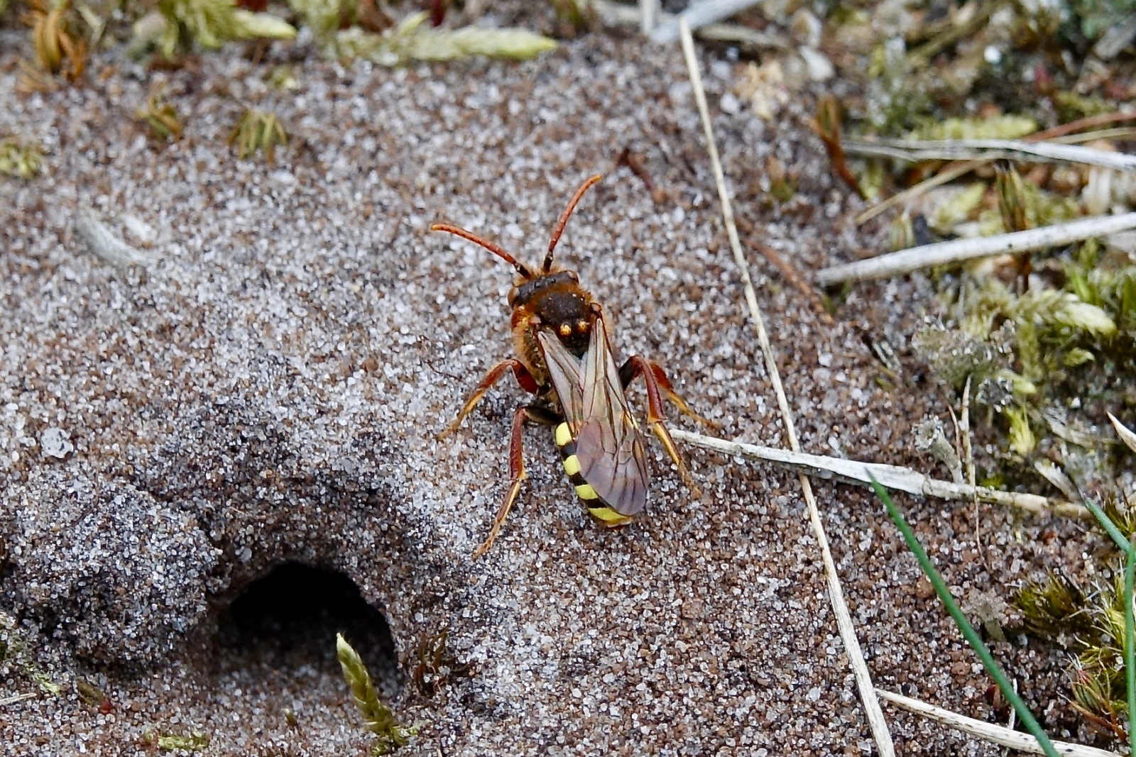 Deze Koekoeksbij legt haar eieren graag in het nest van de Grijze Zandbij. De soort staat op de rode lijst. Oud Meer, Son en Breugel.