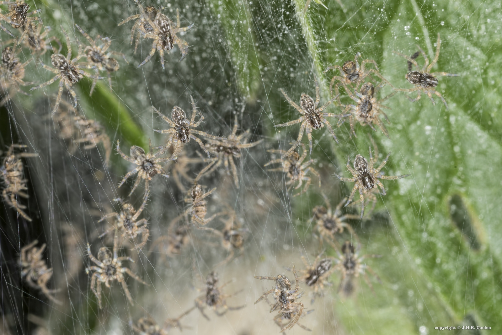 Daar ben ik er 1 van. Super mooie foto van deze spinnetjes. Leuke titel.