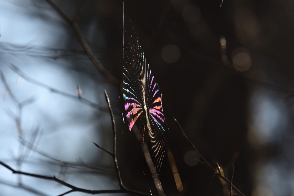 We wandelden in het Leuvenumse bos toen ik omhoog keek naar goudhaantjes, maar op dat moment zag ik zulke spectaculaire kleuren in de lucht hangen, dat ik eerst wilde weten wat dat in hemelsnaam kon zijn. Het bleek een spinnenweb te zijn, dat in de wind wiegde en steeds een veranderend, prachtig kleurenspectrum toonde. Het waren geen druppeltjes, maar de draden zelf die het zonlicht op een bepaalde manier braken. Heel bijzonder om te zien! Net vuurwerk! Andere wandelaars waren ook helemaal verwonderd toen we het hen lieten zien.