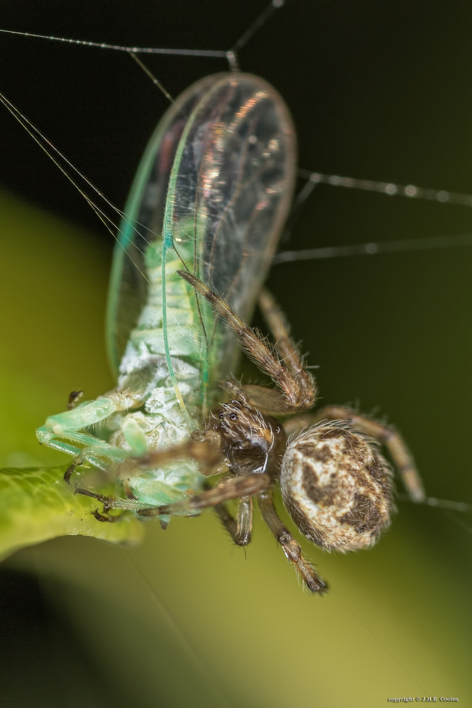 Prachtig vastgelegd ,deze spin met z,n groene hapje. Gefeliciteerd